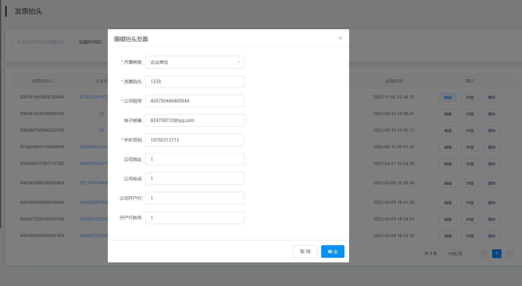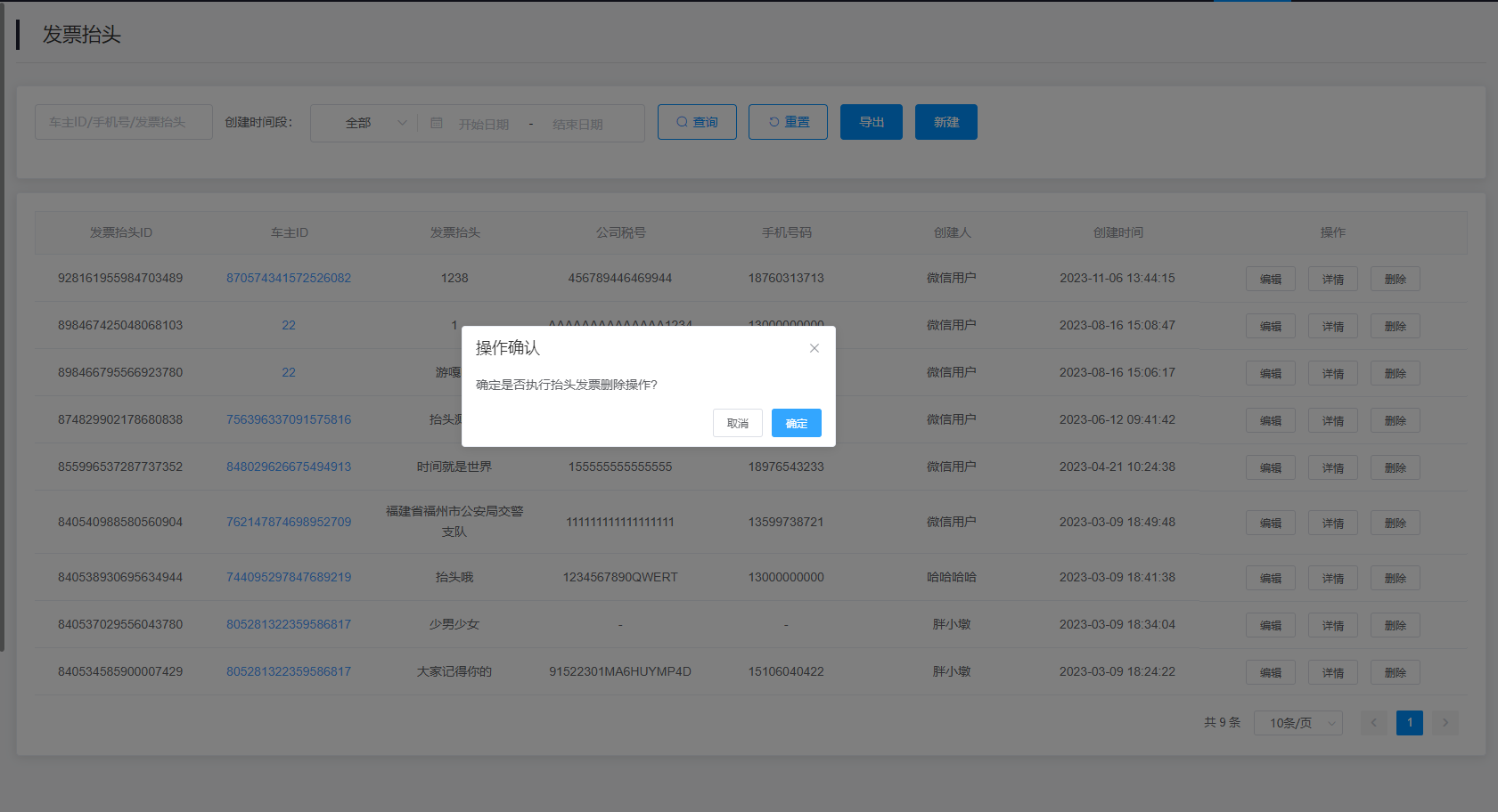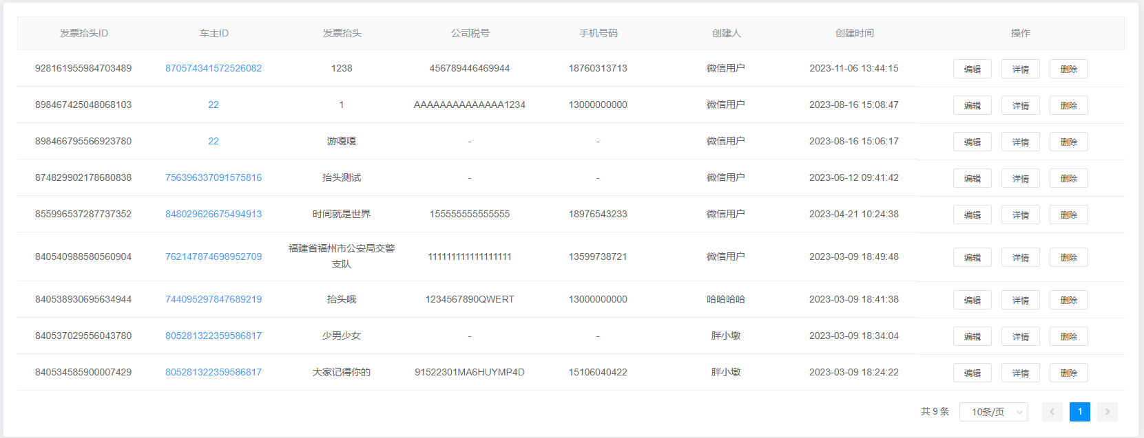 2.查询结果:该查询结果由发票抬头ID、车主ID、发票抬头、公司税号、手机号码、创建人、创建时间、操作组成。通过查询条件进行筛查抬头发票信息查找。