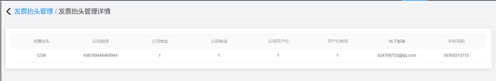 详情:点击查询结果右侧的“详情”按钮可以查看该发票抬头管理详情。