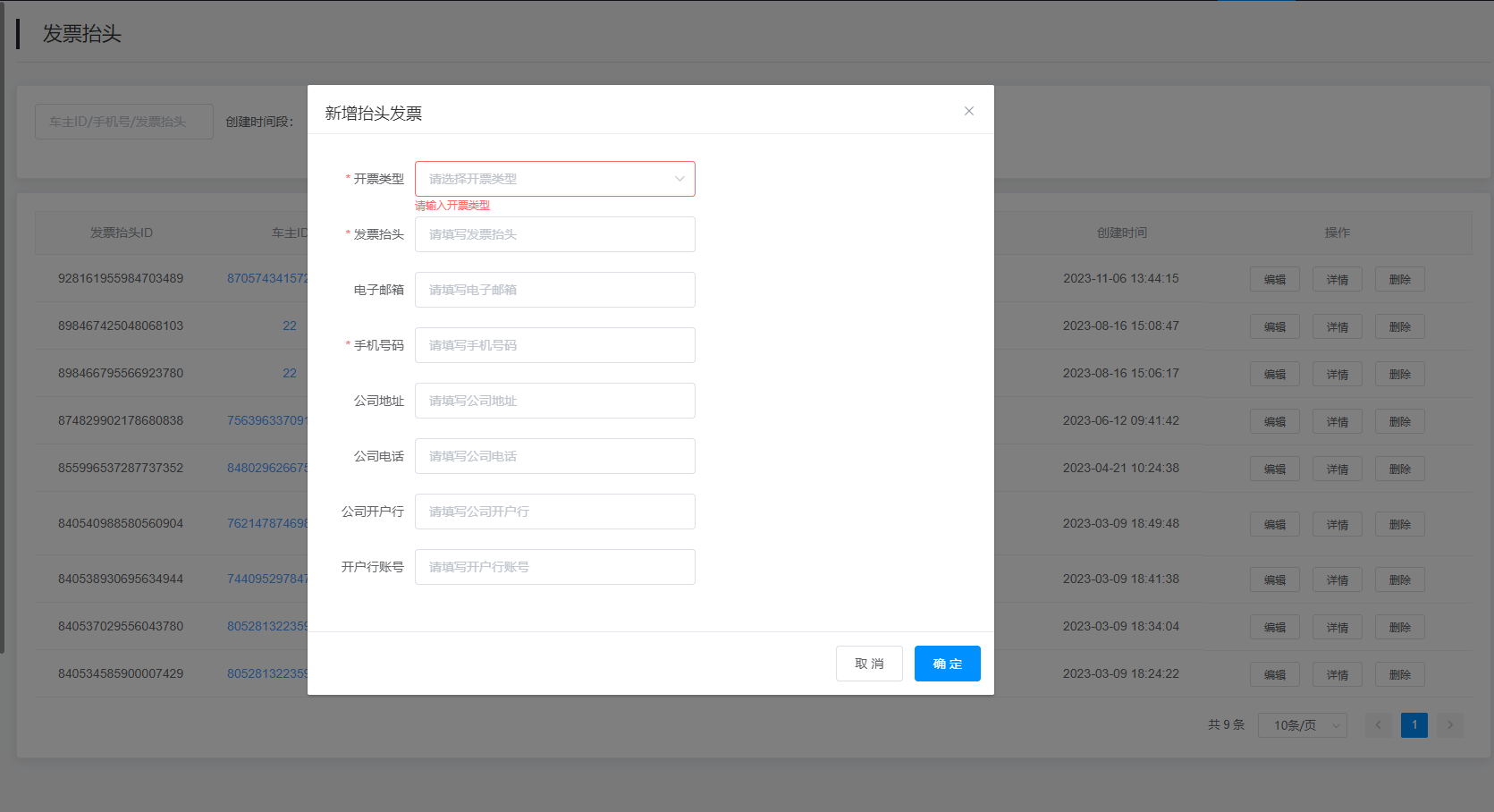 车主ID/手机号/发票抬头:通过搜索车主ID/手机号/发票抬头查找发票抬头信息;