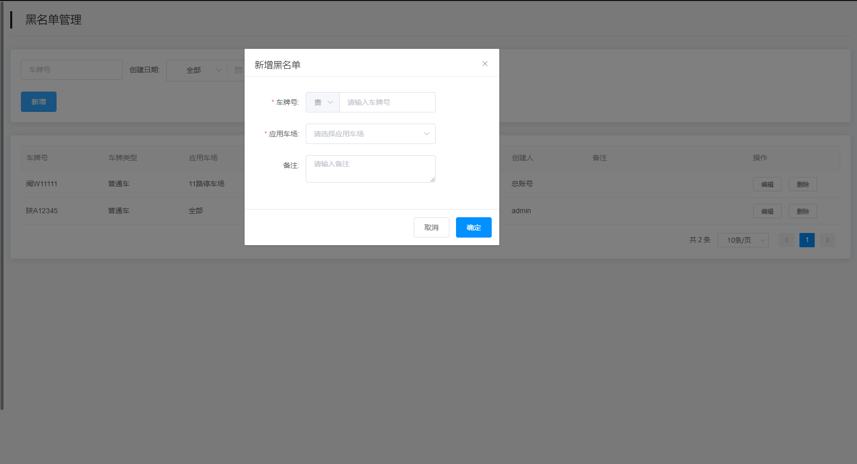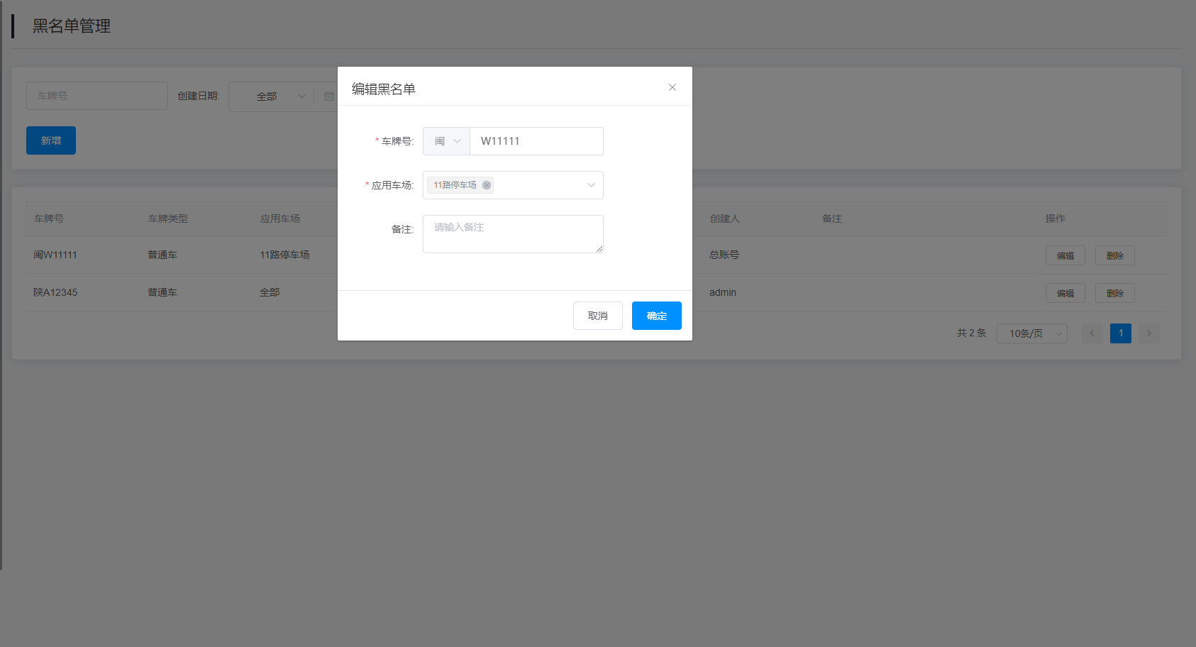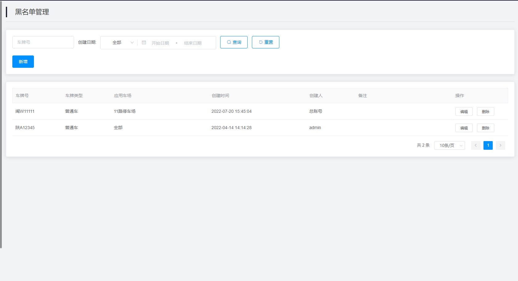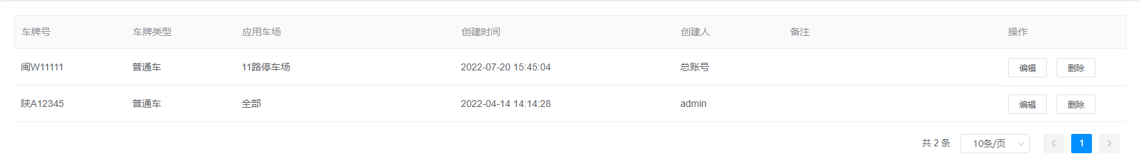 2.查询结果:该查询结果由车牌号、车牌类型、应用车场、创建时间、创建人、备注、操作组成。通过查询条件进行筛查黑名单管理信息查找。
