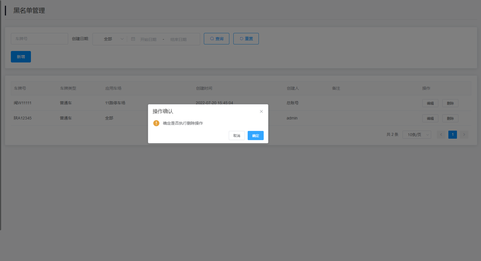 删除:点击查询结果右侧的“删除”按钮进行单条黑名单车牌信息删除。