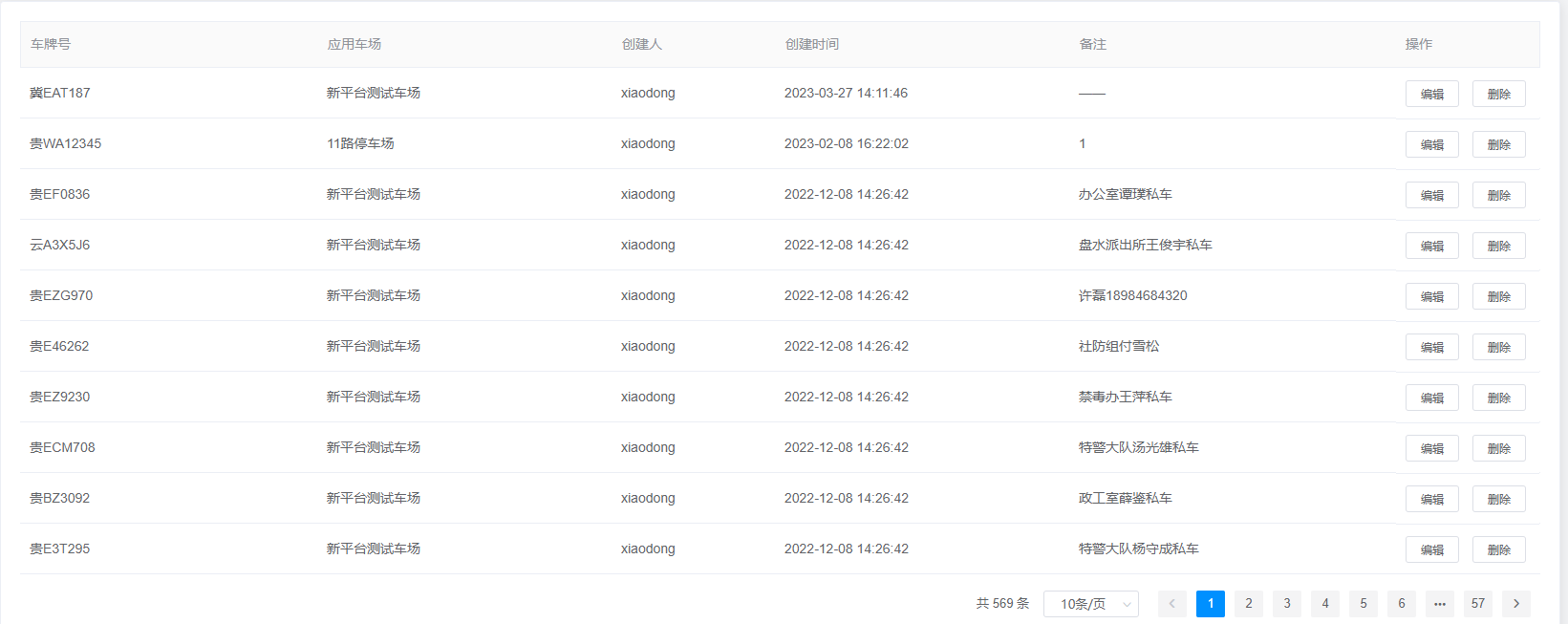 4.查询结果:该查询结果由车牌号、应用车场、创建人、创建时间、备注、操作组成。通过查询车牌号进行筛查车牌信息查找。