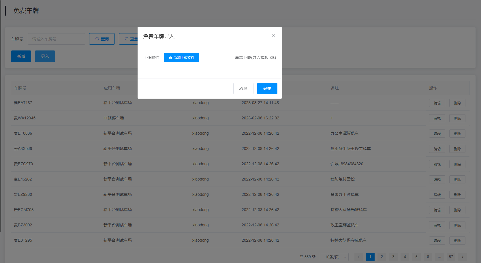 2.批量导入免费车牌:可通过点击查找内容左下方的“导入”按钮来上传excel文件批量新增免费车牌。