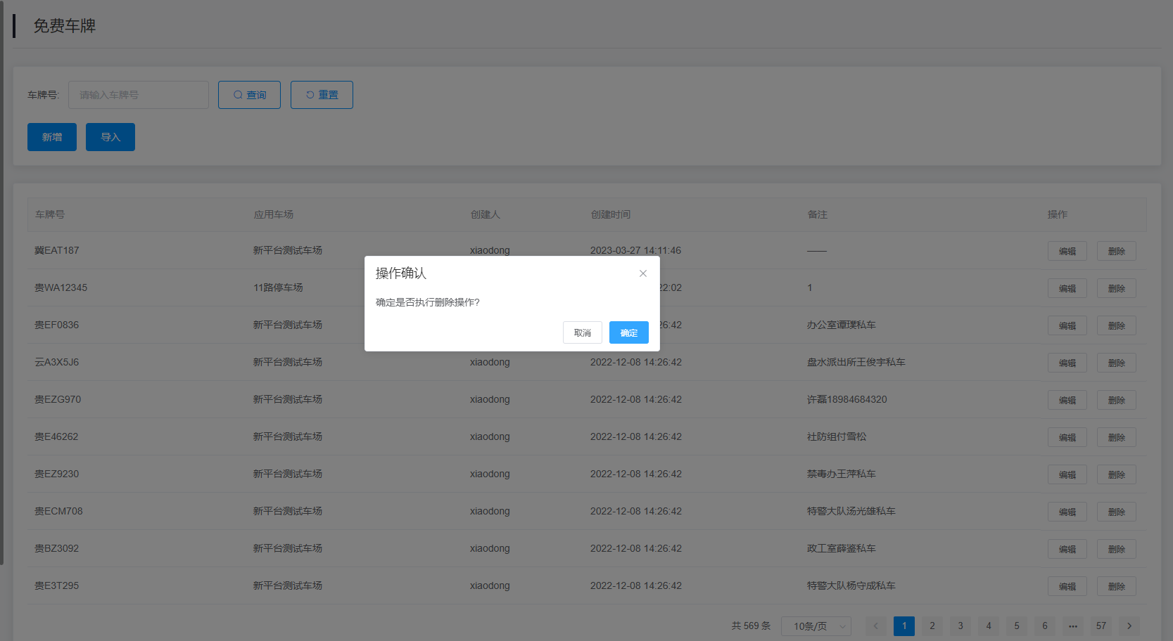 删除:点击查询结果右侧的“删除”按钮进行确认是否删除单条免费车牌信息操作。