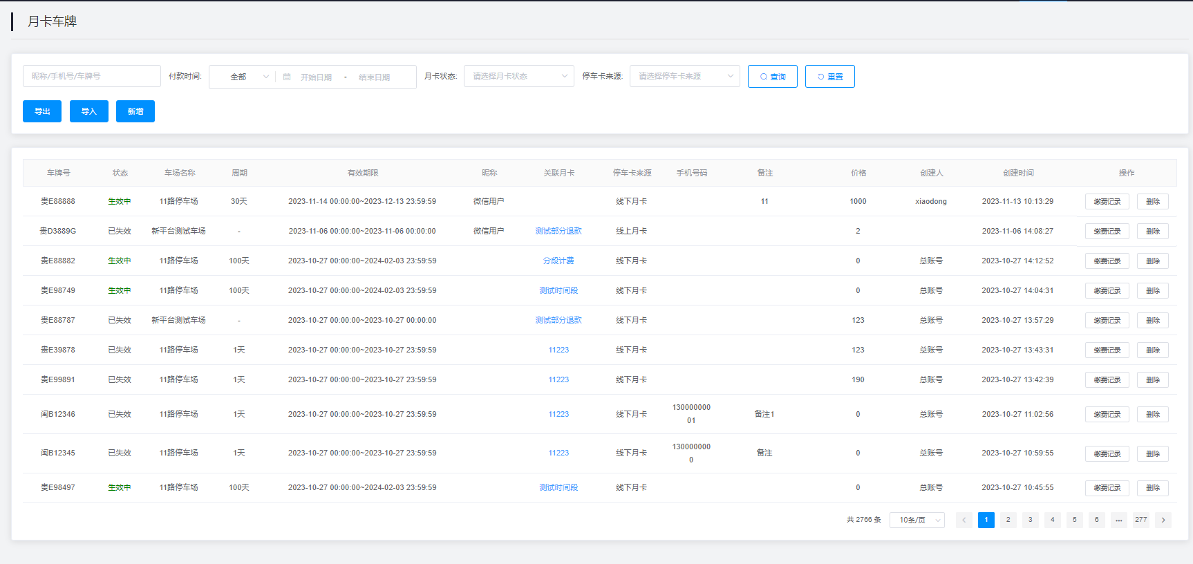 可以在月卡车牌上查询、筛选、编辑、删除到所有办理月卡的车牌信息历史详情。