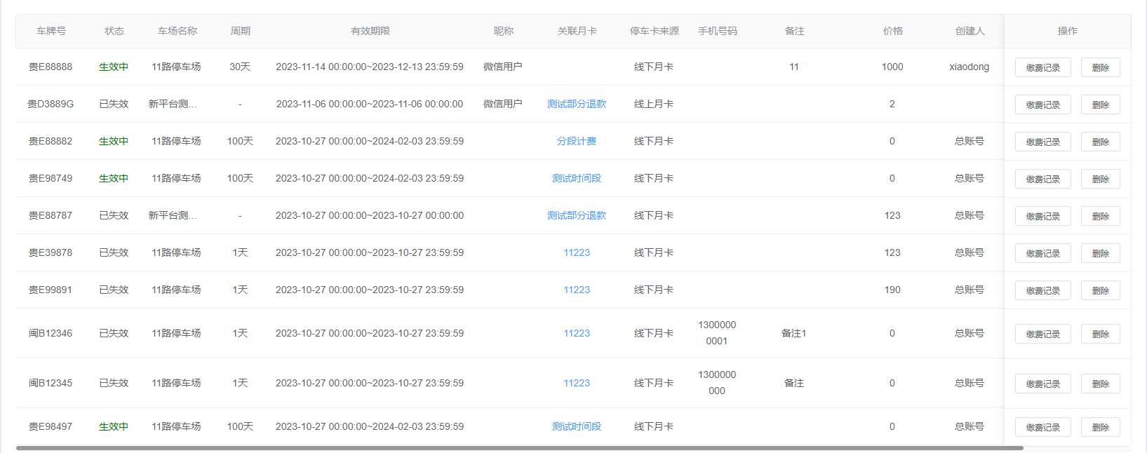 2.查询结果:该查询结果由车牌号、状态、车场名称、周期、有效期限、昵称、关联月卡、停车卡来源、手机号码、备注、价格、创建人、操作组成。通过查询条件进行筛查月卡车牌信息查找。