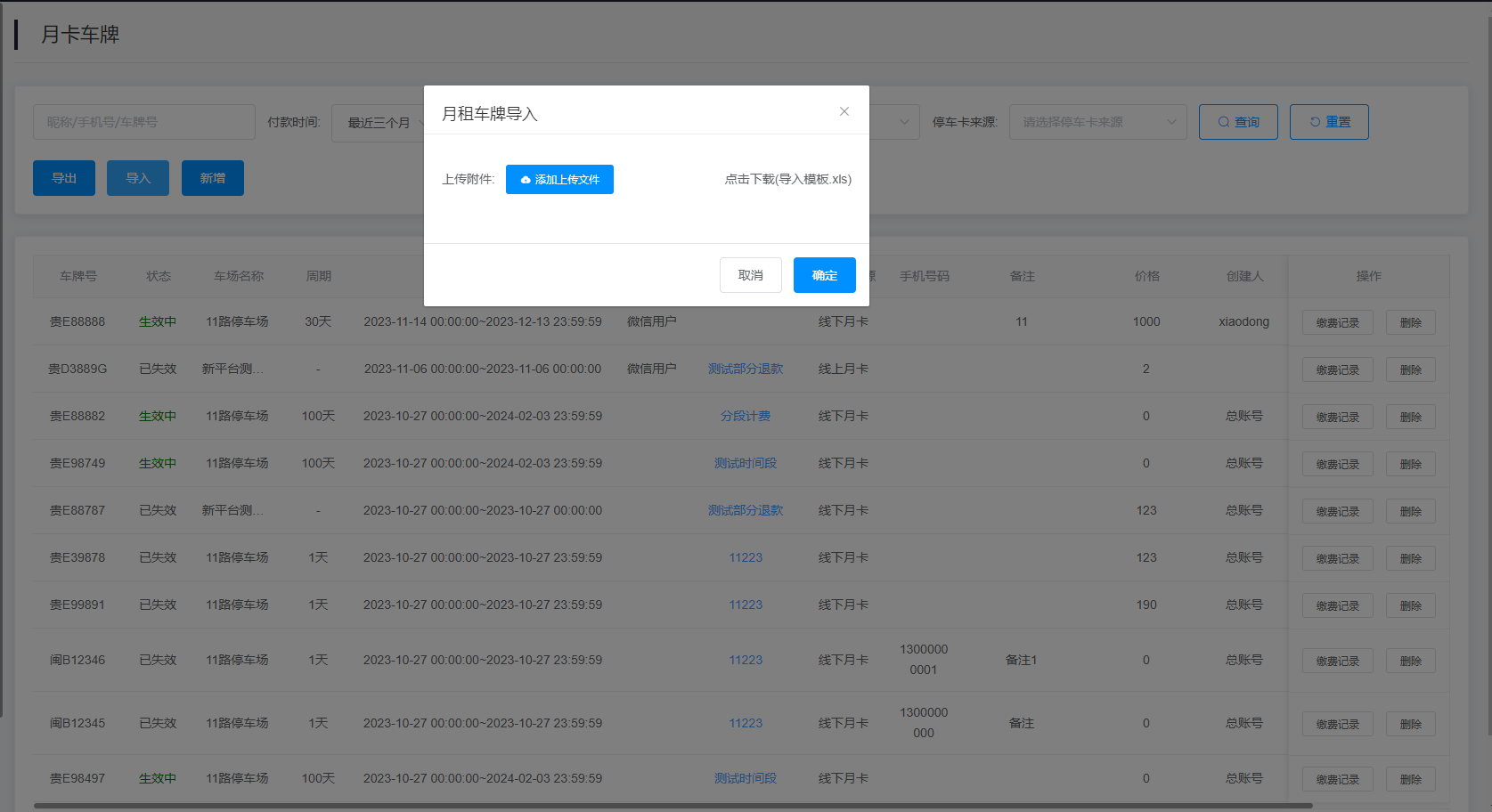 3.批量导入/导出月卡车牌:可通过点击查找内容左下方的“导入”按钮来上传excel文件批量新增免费车牌,点击查找内容左下方的“导出”按钮来下载当前查找条件下的所有月卡车牌信息。