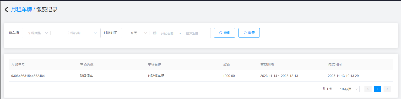 点击查询结果右侧的缴费记录进行查询月租车牌的缴费记录。
