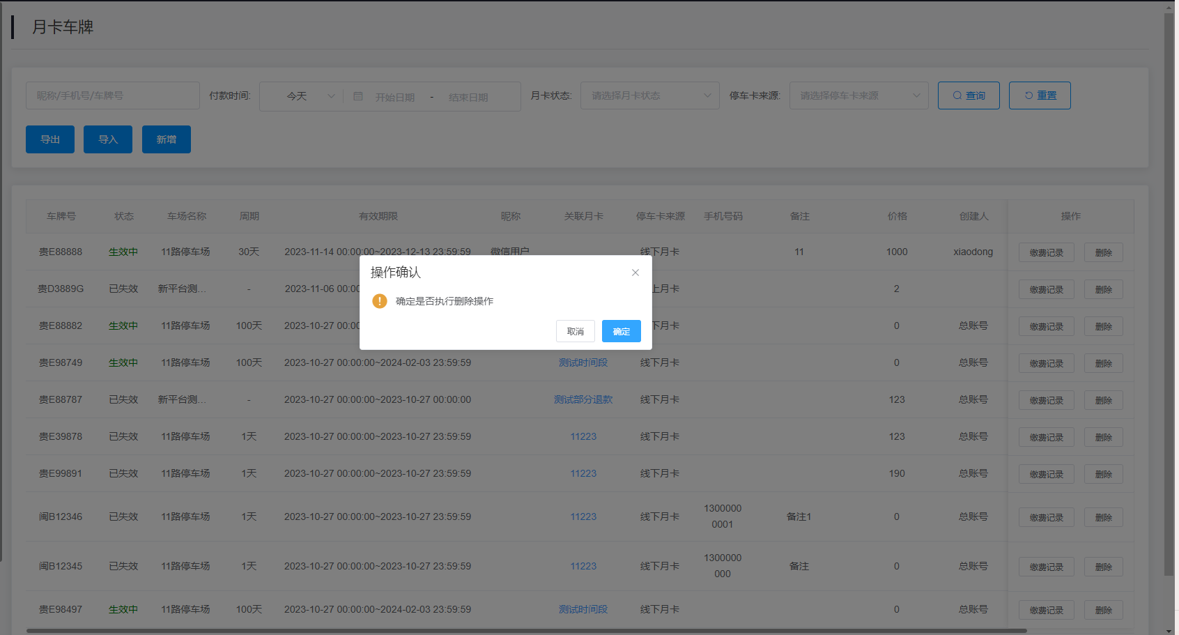 点击查询结果右侧的“删除”按钮进行确认是否执行单条月卡车牌信息的删除操作。