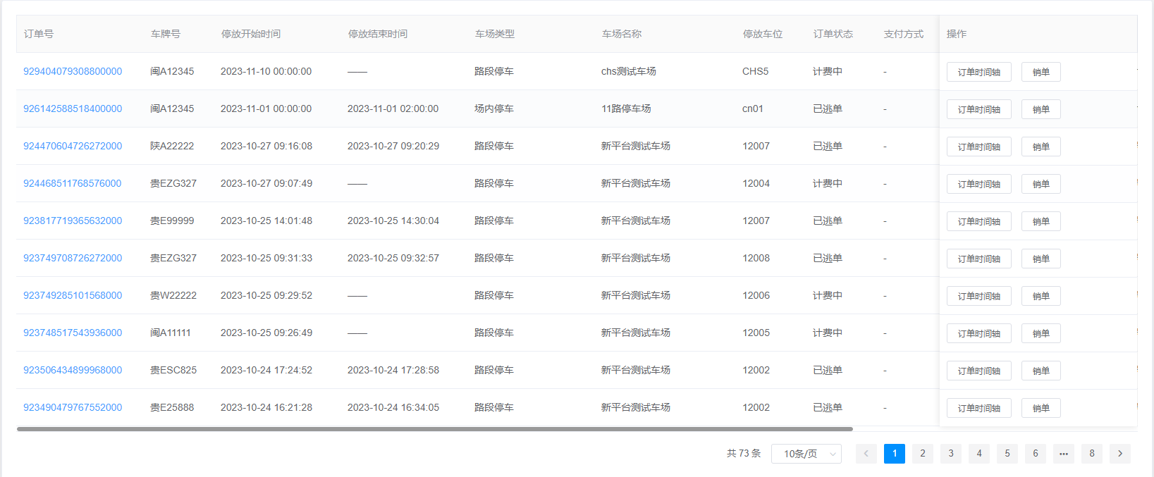 2.查询结果:该查询结果由订单号、车牌号、停放开始时间、停放结束时间、车场类型、车场名称、停放车位、订单状态、支付方式、操作组成。通过查询条件进行筛查补单订单信息查找。