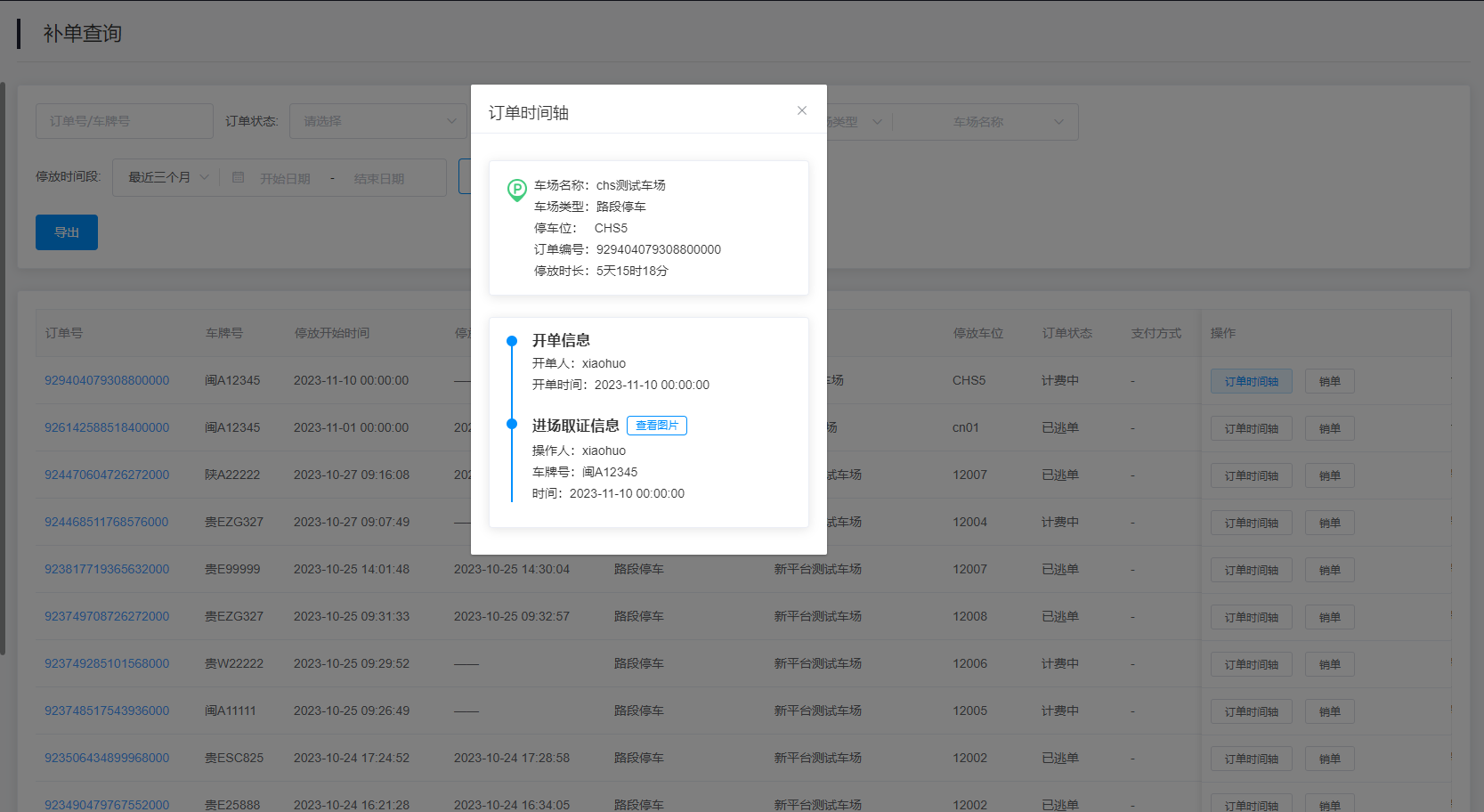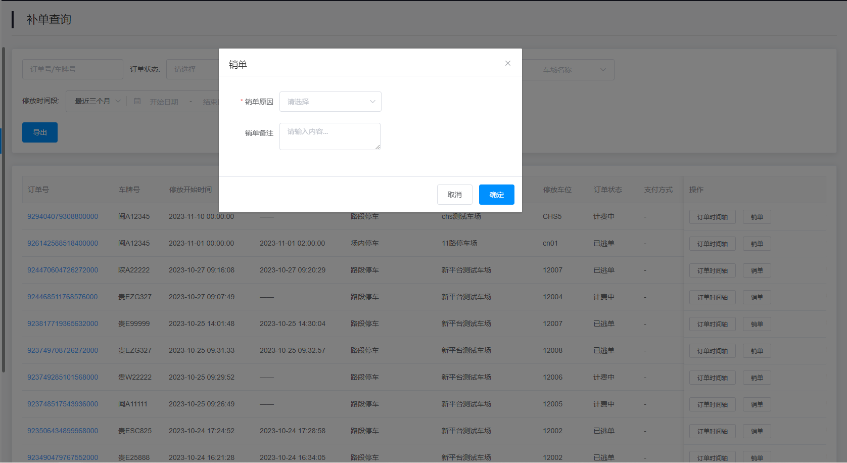 停放时间段:可通过选择停放时间段进行补单订单筛查。