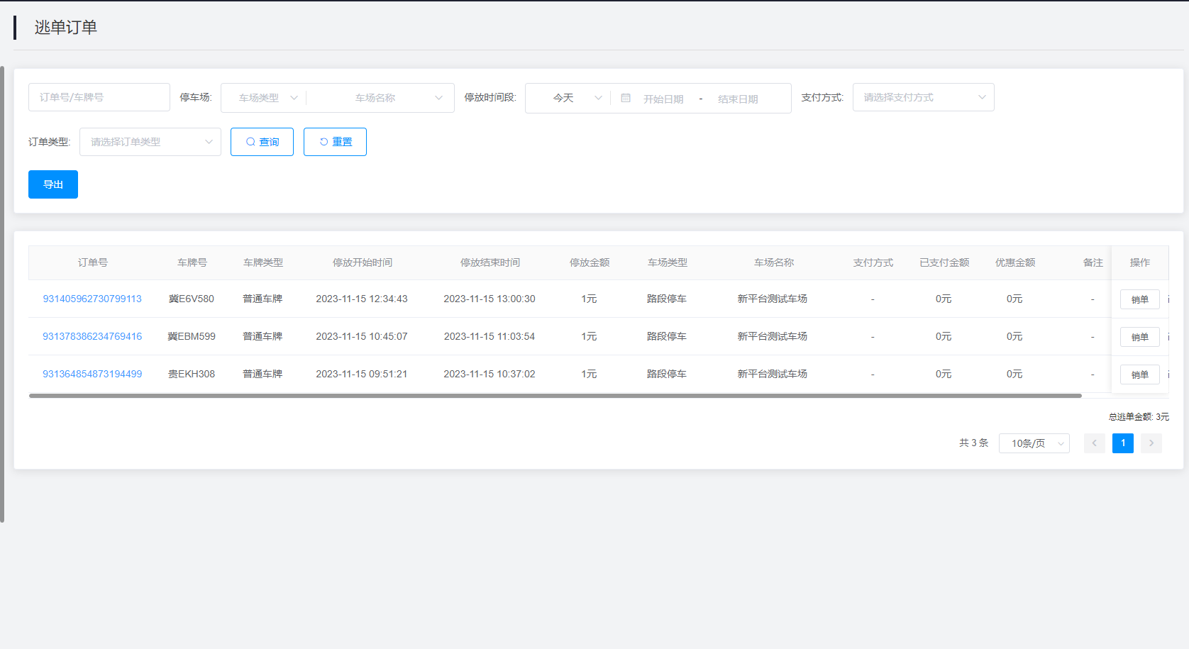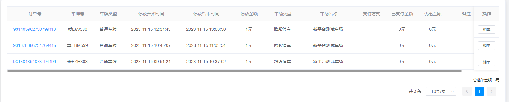 2.查询结果:该查询结果由订单号、车牌号、车牌类型、停放开始时间、停放结束时间、停放金额、车场类型、车场名称、支付方式、已支付金额、优惠金额、备注、订单类型、操作组成。通过查询条件进行筛查逃单订单信息查找。