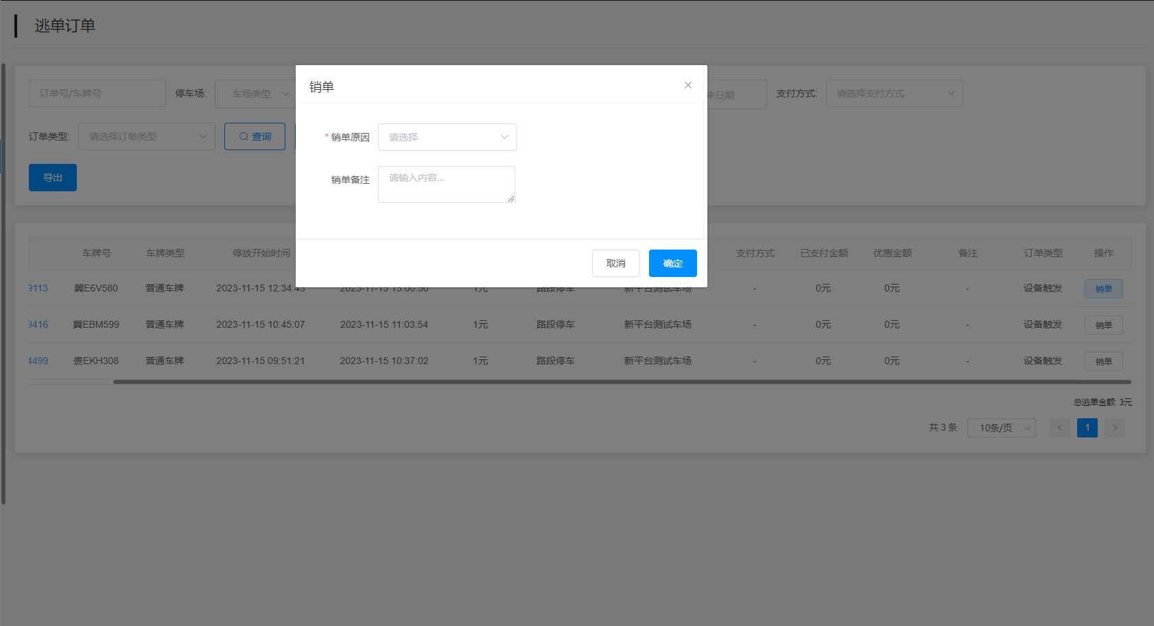 订单号/车牌号:通过搜索订单号/车牌号查找逃单订单信息;