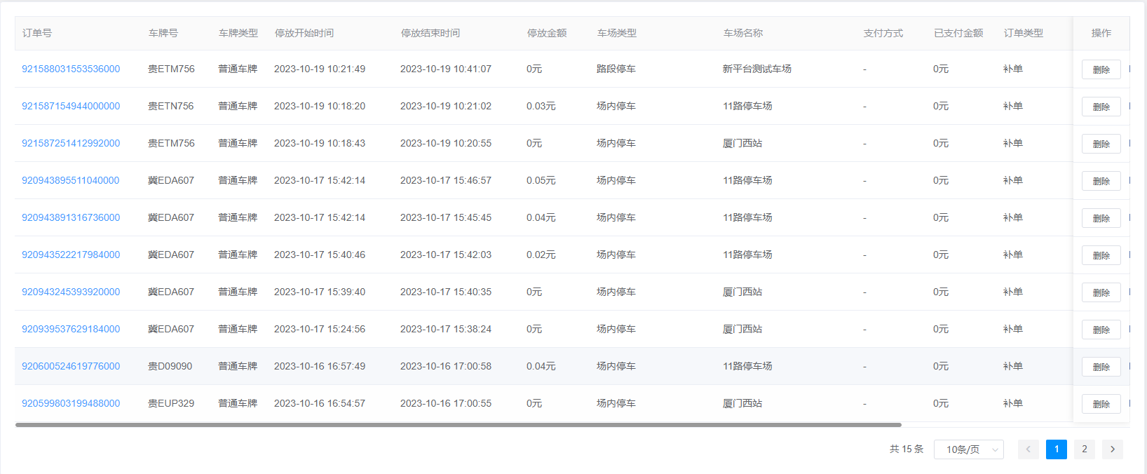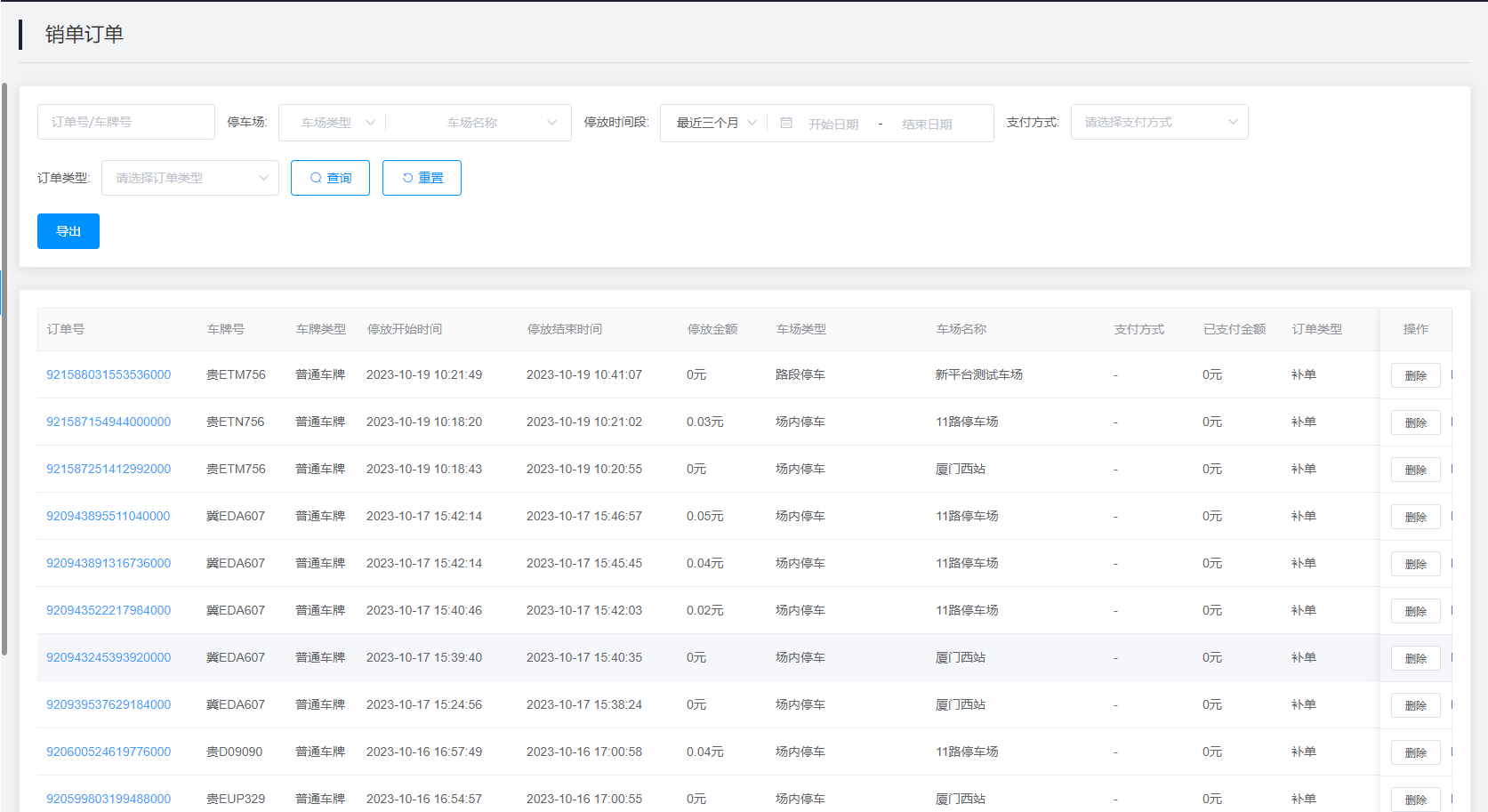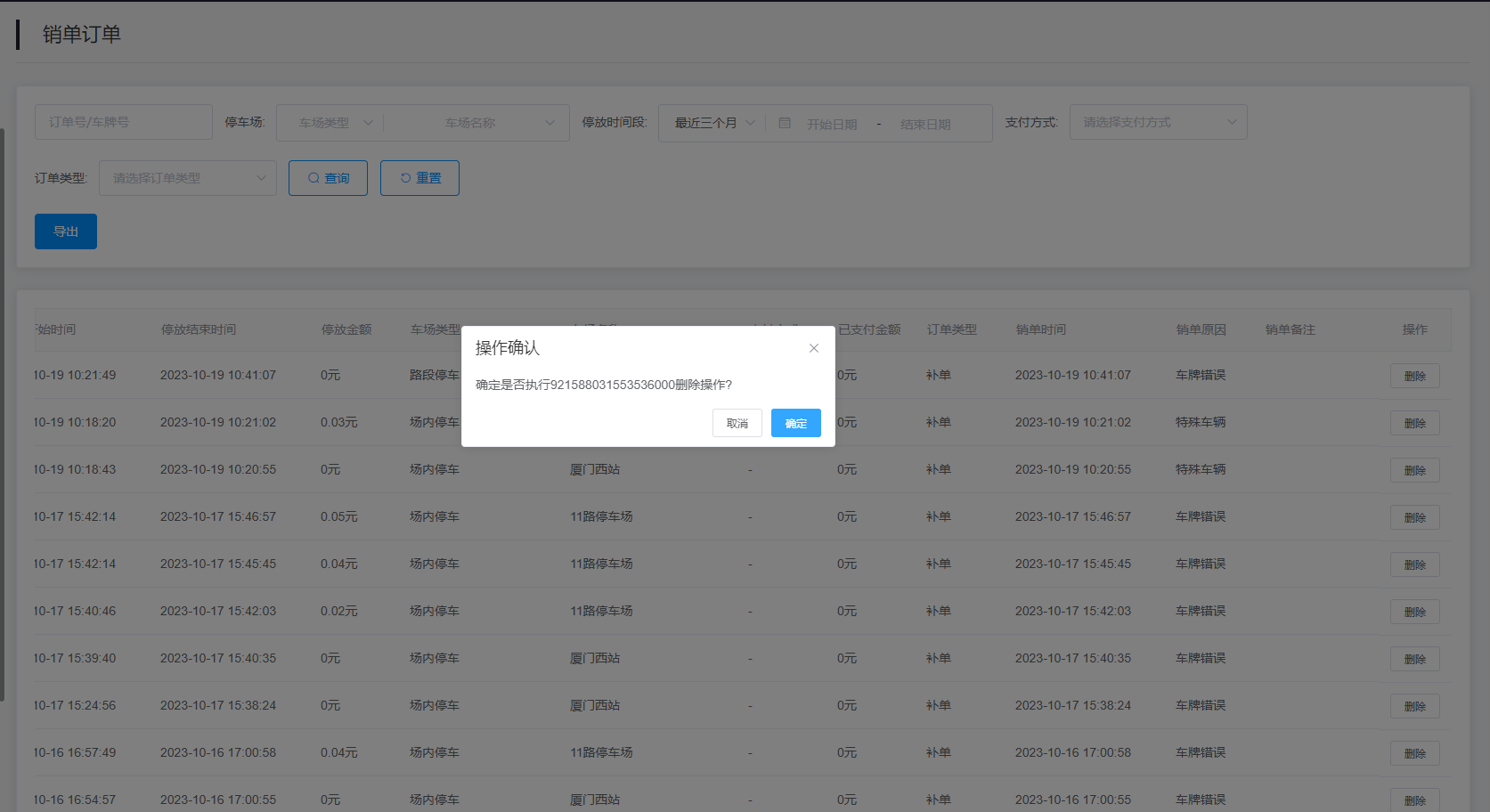 2.查询结果:该该查询结果由订单号、车牌号、车牌类型、停放开始时间、停放结束时间、车场类型、支付方式、已支付金额、订单类型、销单时间、销单备注、操作组成。通过查询条件进行筛查销单订单信息查找。