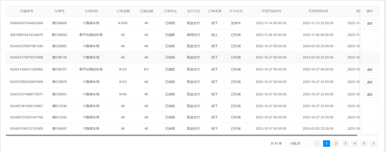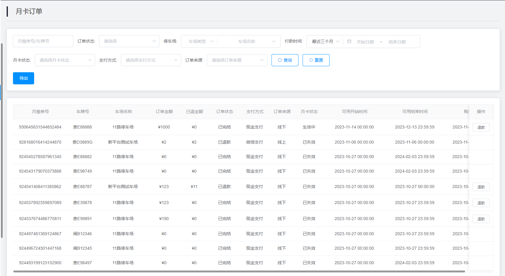 2.查询结果:该查询结果由月缴单号、车牌号、车场名称、订单金额、已退金额、订单状态、支付方式、订单来源、月卡状态、可用开始时间、可用结束时间、购买时间、操作组成。通过查询条件进行筛查月卡订单信息查找。