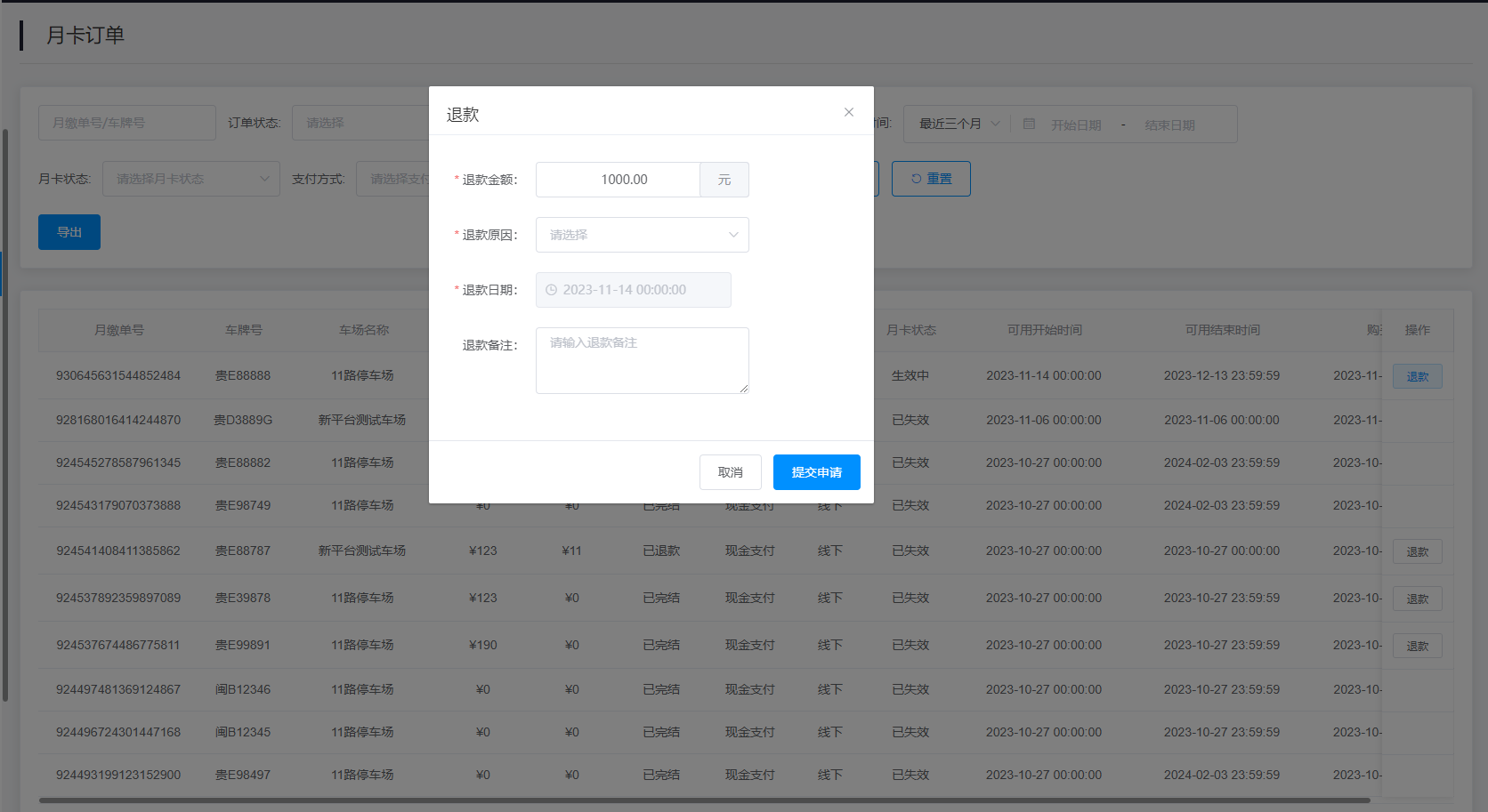 退款:点击查询结果右侧的“退款”按钮可以编辑该月卡订单的退款金额、退款原因、退款日期、退款备注并提交申请。