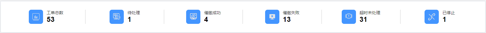 数据统计概况:该数据统计分别为工单总数、待处理、催缴成功、催缴失败、超时未处理、已停止。