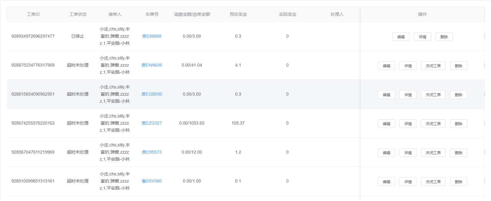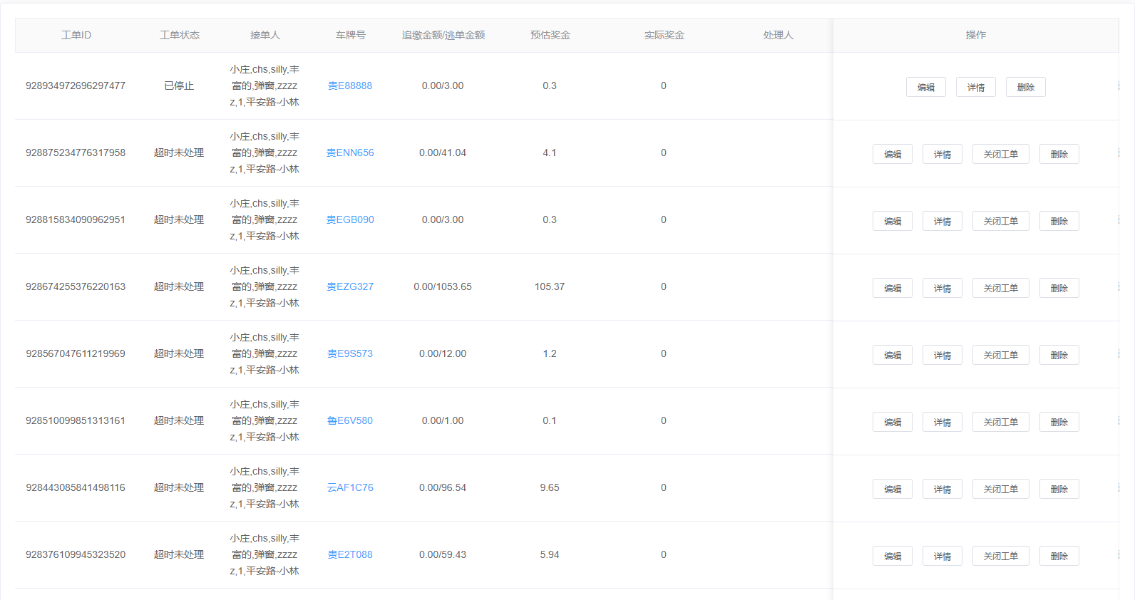 4.查询结果:该查询结果由工单ID、工单状态、接单人、车牌号、追缴金额/逃单金额、预估奖金、实际奖金、处理人、处理时间、处理耗时、创建人、创建时间、操作组成。通过查询条件进行筛查催付工单信息查找。