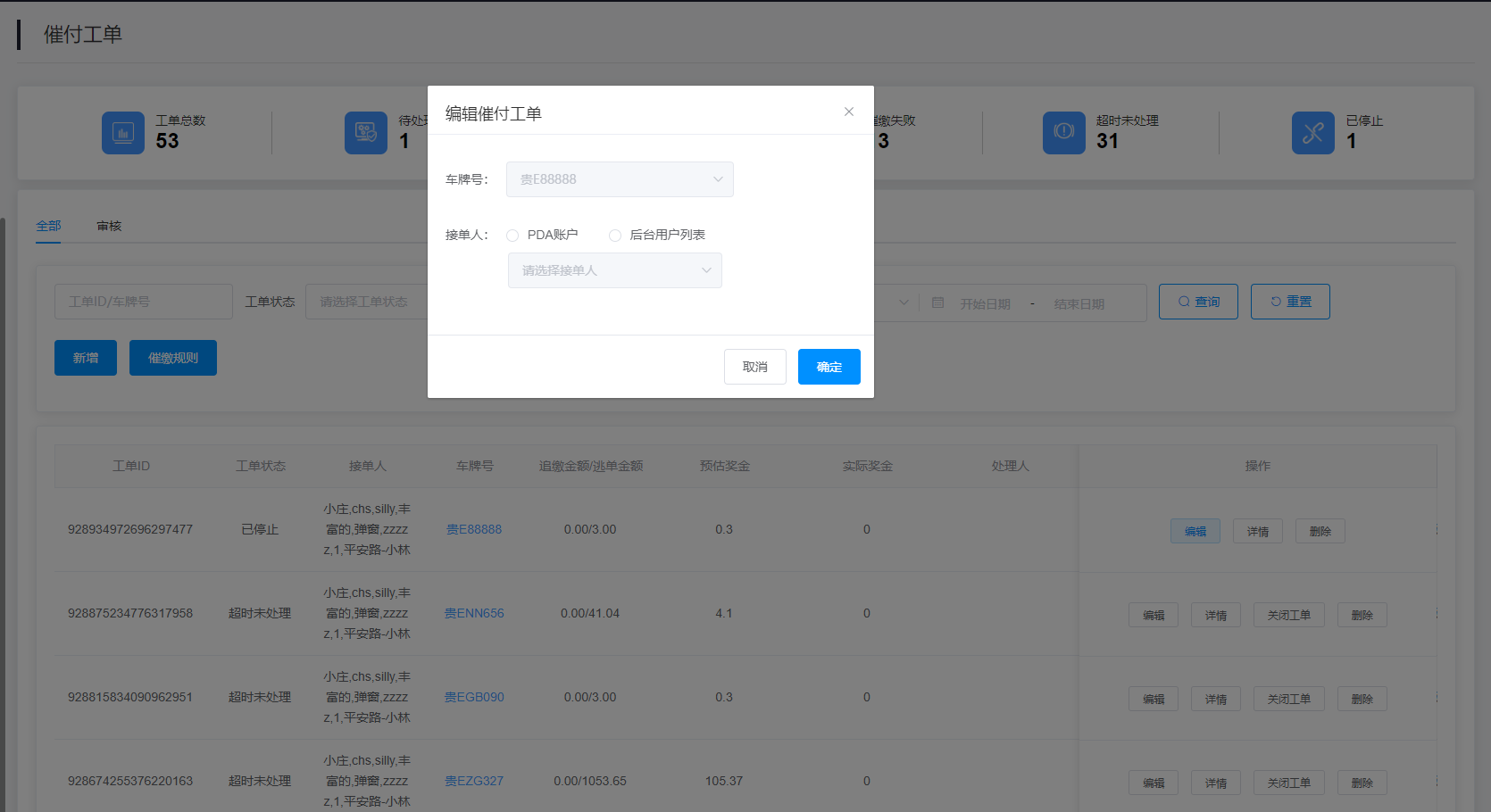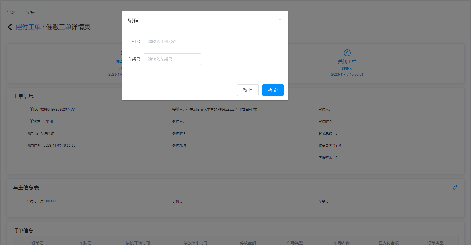 编辑:点击查询结果右侧的“编辑”按钮可以编辑该催付工单的车牌号、接单人。