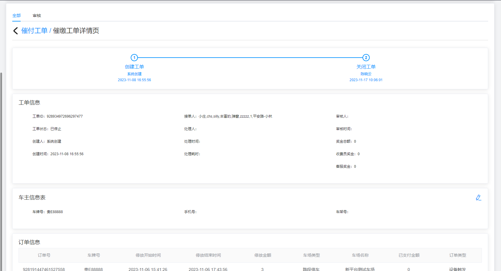 详情:点击查询结果右侧的“详情”按钮可以查看该催付工单的催缴工单详情页。在车主信息表的右上角点击画笔即可编辑车主手机号和车架号。
