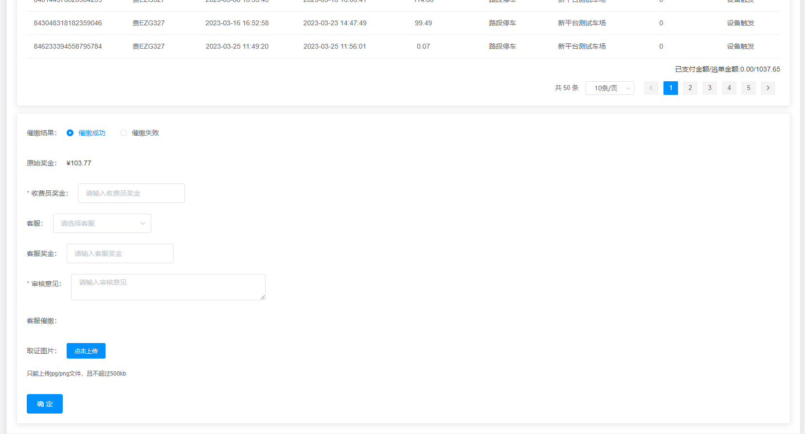 详情:点击查询结果右侧的“详情”按钮可以查看该催付工单的催缴工单详情页。在车主信息表的右上角点击画笔即可编辑车主手机号和车架号。在详情页底下可填写催缴结果、原始奖金、收费员奖金、客服、客服奖金、审核意见、客服催缴、上传取证图片进行审核。