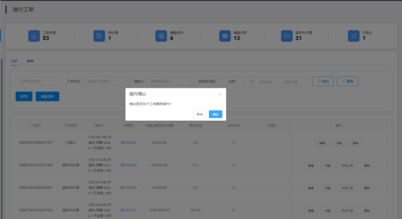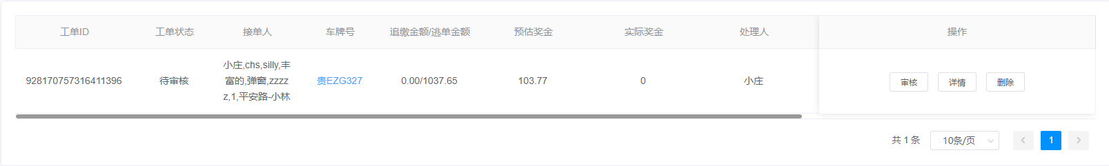 2.查询结果:该查询结果由工单ID、工单状态、接单人、车牌号、追缴金额/逃单金额、预估奖金、实际奖金、处理人、处理时间、处理耗时、创建人、创建时间、操作组成。通过查询条件进行筛查催付工单信息查找。