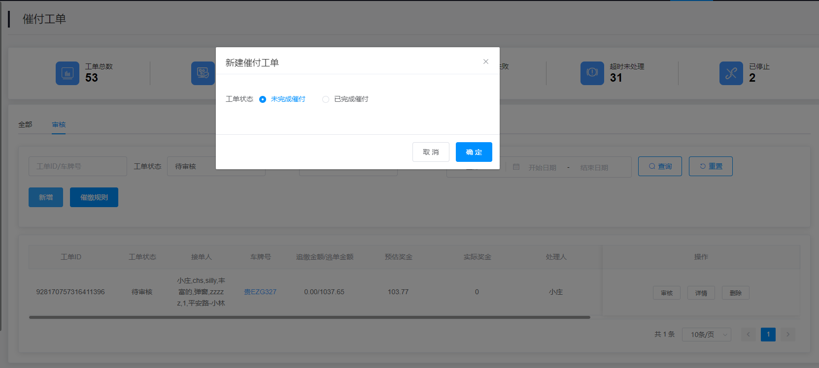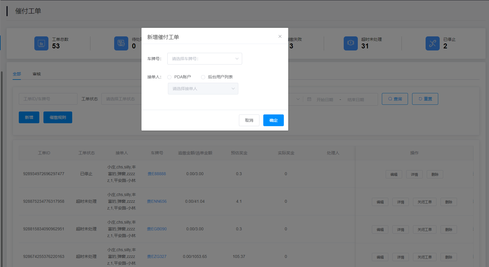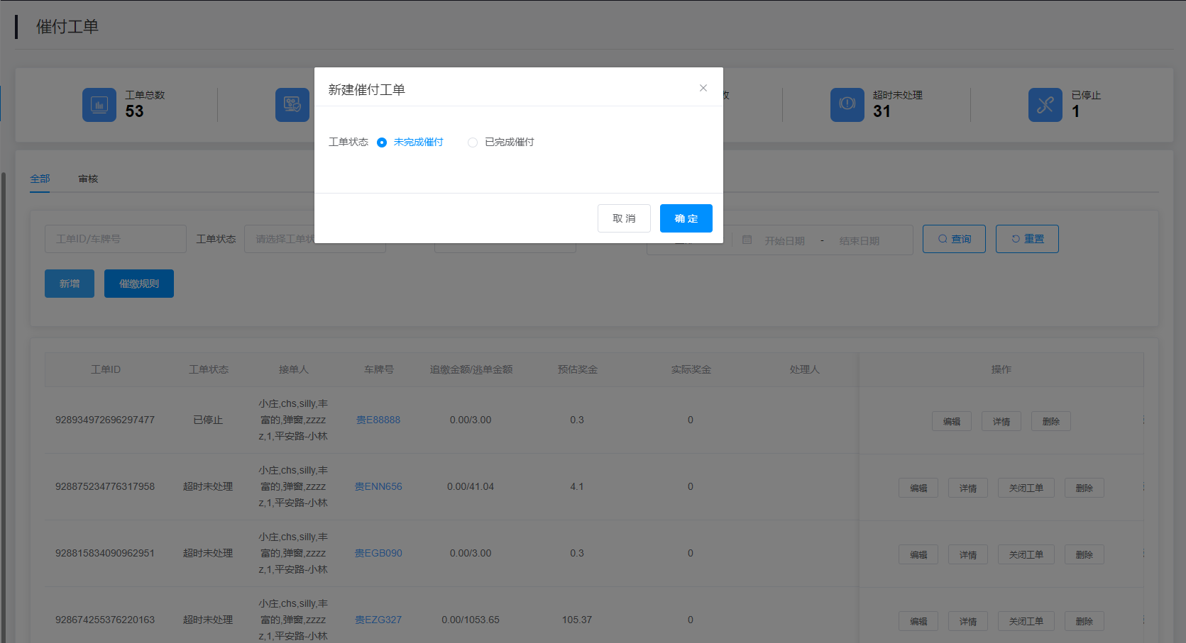 2.新增:点击查询内容左下方的“新增”按钮即可选择工单状态,填写车牌号和接单人新增催缴工单。