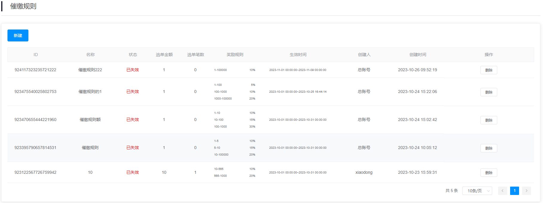 可通过点击查询内容左下方的“催缴规则”按钮来查看当前所有催缴规则,其中催缴规则由ID、名称、状态、逃单金额、逃单笔数、奖励规则、生效时间、创建人、创建时间、操作组成;
