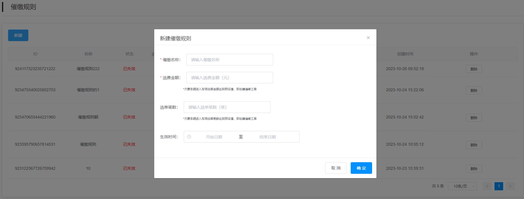在催缴规则左上角点击“新建”即可填写催缴名称、逃费金额、逃单笔数、生效时间新增催缴规则;