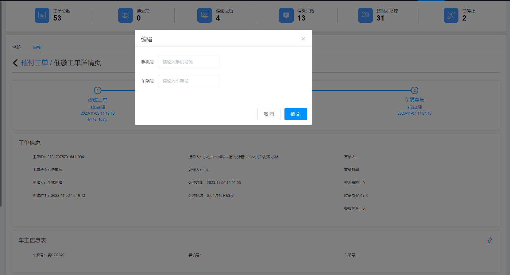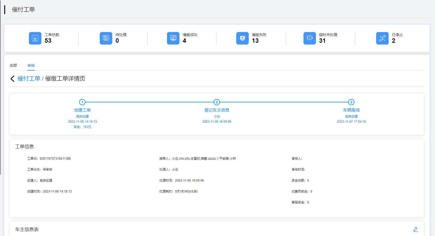 审核:点击查询结果右侧的“审核”按钮可以查看该催付工单的催缴工单详情页。在车主信息表的右上角点击画笔即可编辑车主手机号和车架号。在详情页底下可填写催缴结果、原始奖金、收费员奖金、客服、客服奖金、审核意见、客服催缴、上传取证图片进行审核。