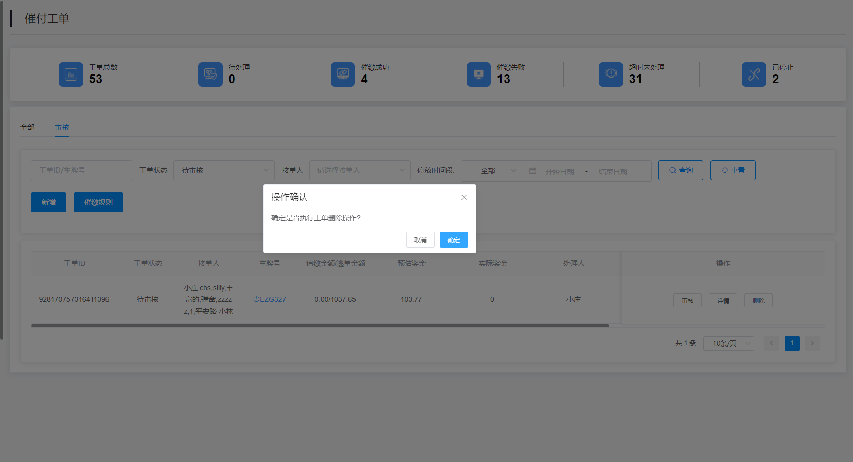 可以在催付工单上查询、筛选、审核到所有催付工单历史详情。