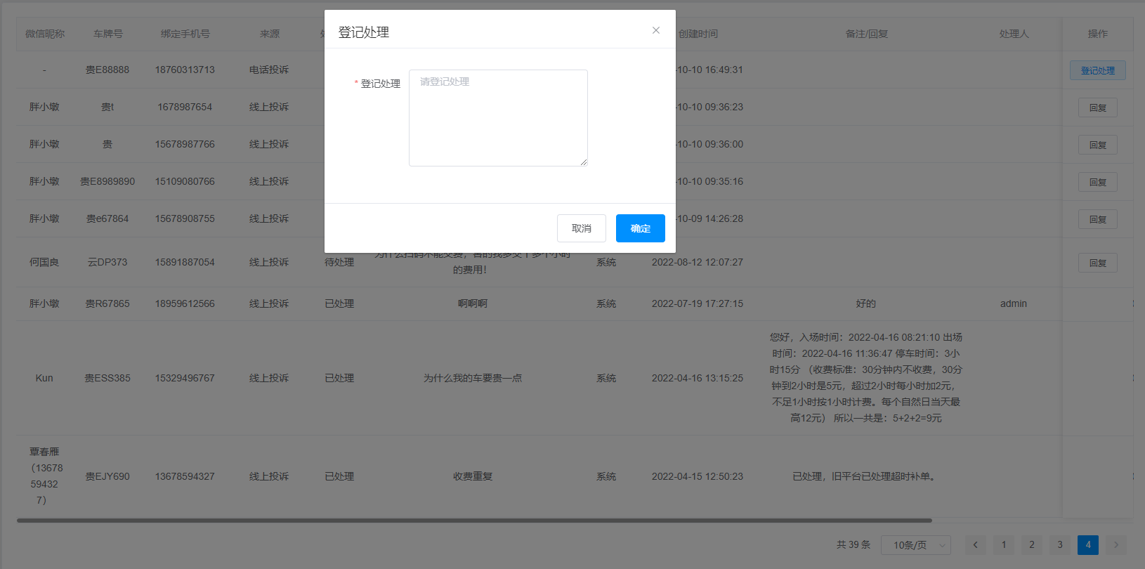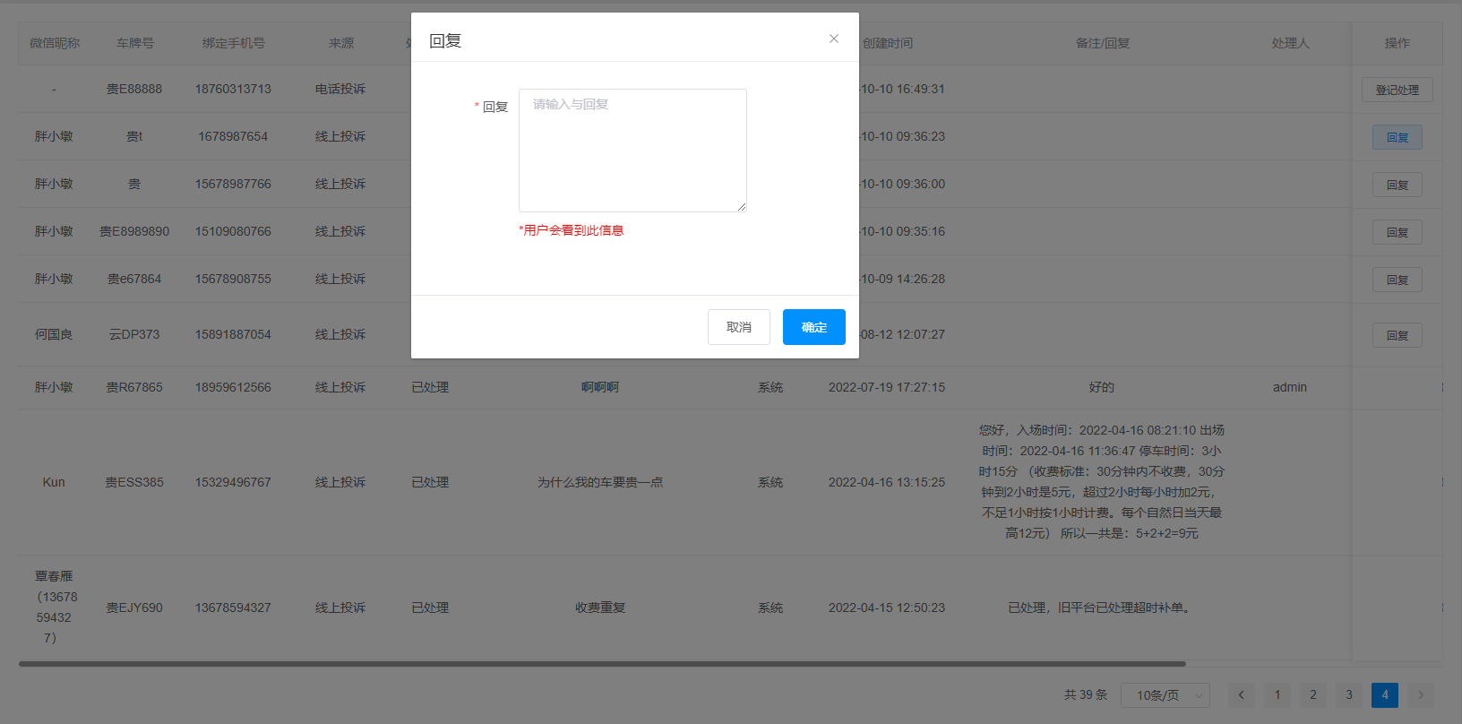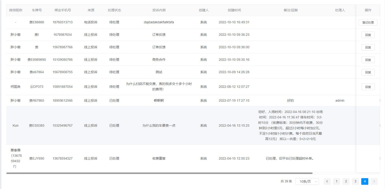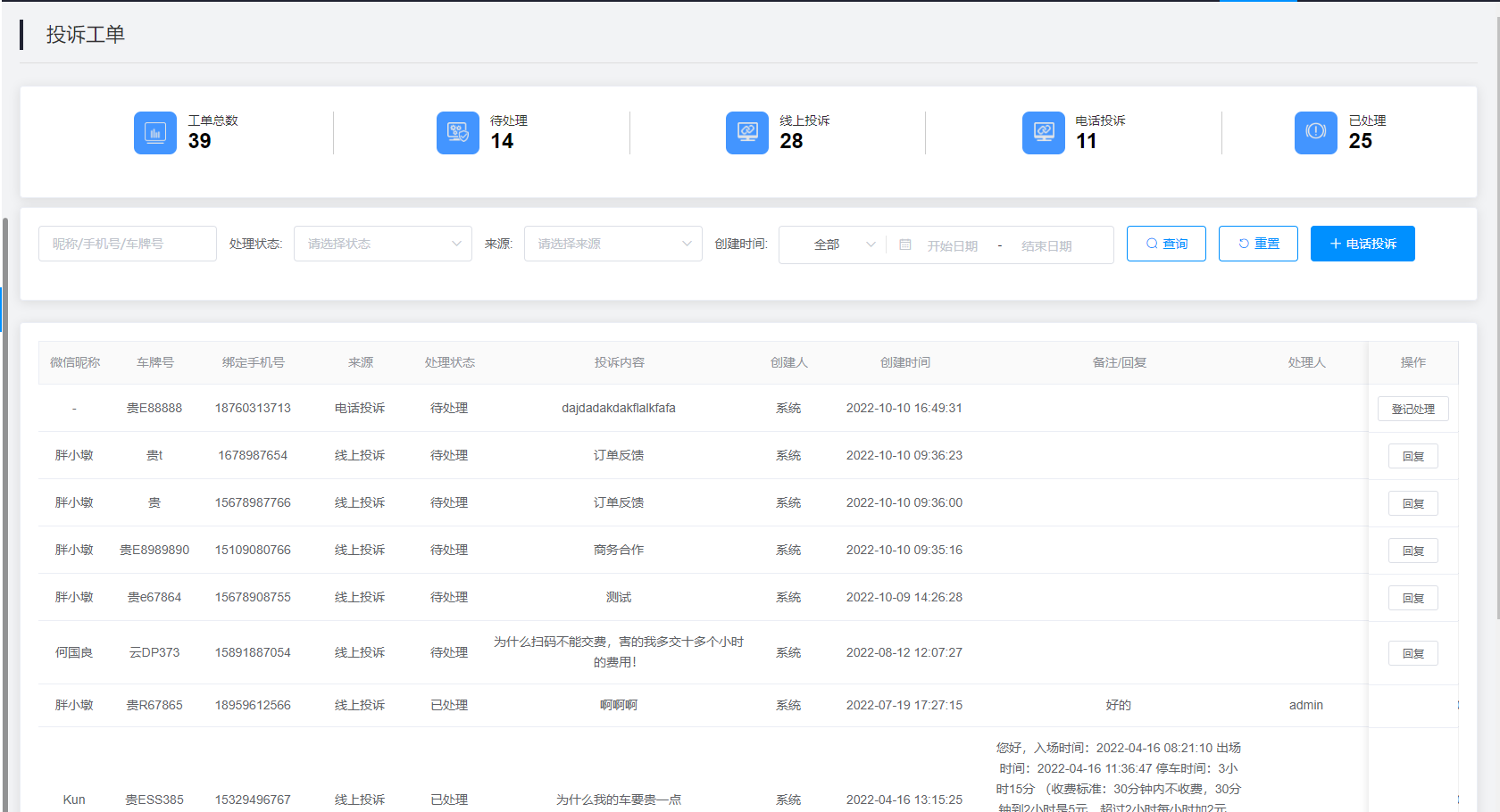 2.查询结果:该查询结果由微信昵称、车牌号、绑定手机号、来源、处理状态、投诉内容、创建人、创建时间、备注/回复、处理人、处理时间、处理耗时、操作组成。通过查询条件进行筛查投诉工单信息查找。