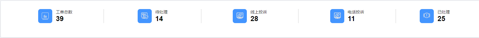 数据统计概况:该数据统计分别为工单总数、待处理、线上投诉、电话投诉、已处理。