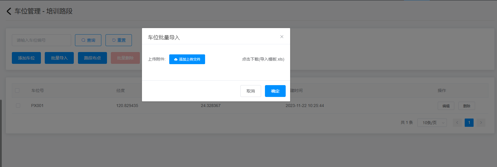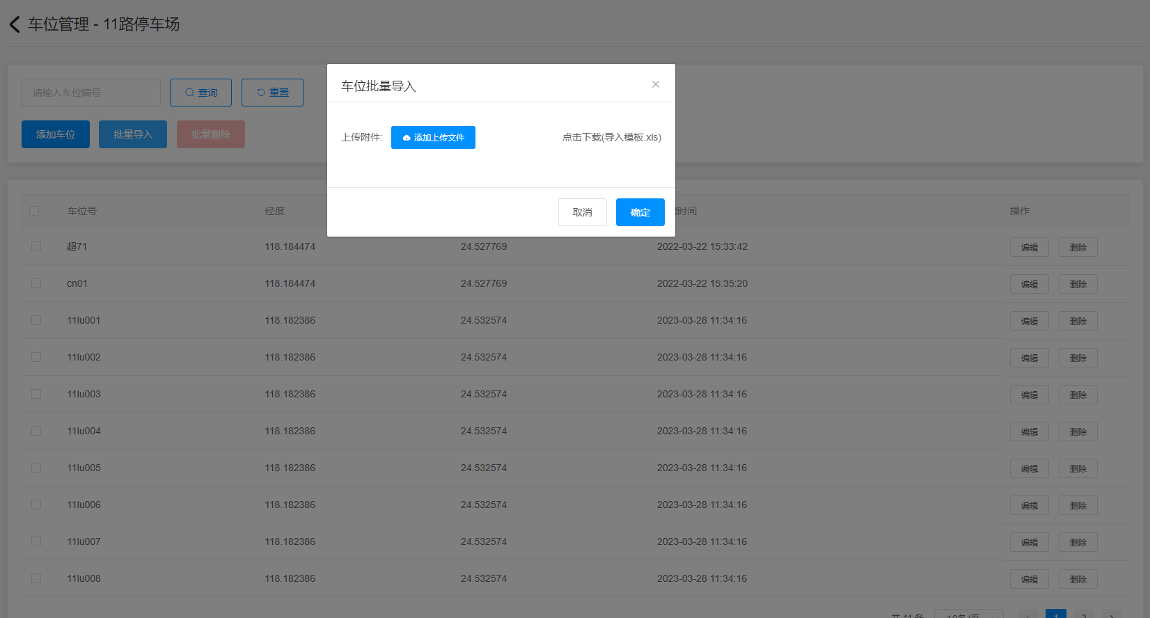 2.批量导入:点击查询内容左下方的“批量导入”即可上传附件进行车位批量导入;