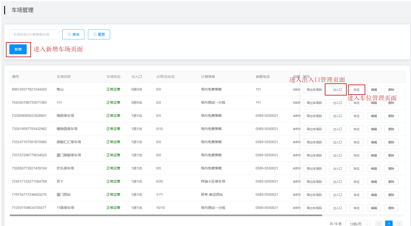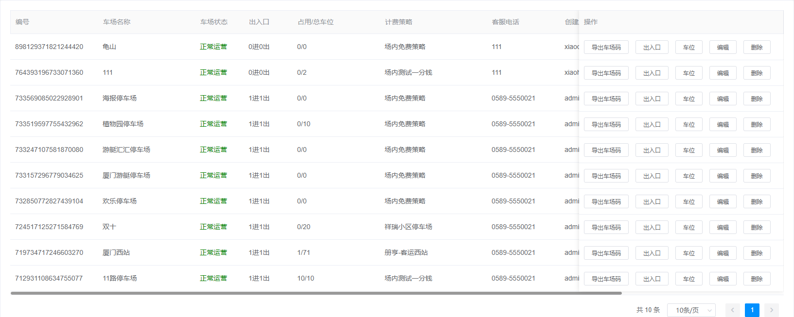 3.查询结果:该查询结果由编号、车场名称、车场状态、出入口、占用/总车位、计费策略、客服电话、创建人、创建时间、备注、操作(导出车场码、出入口、车位、编辑、删除)组成。通过查询条件进行筛查车场信息查找。
