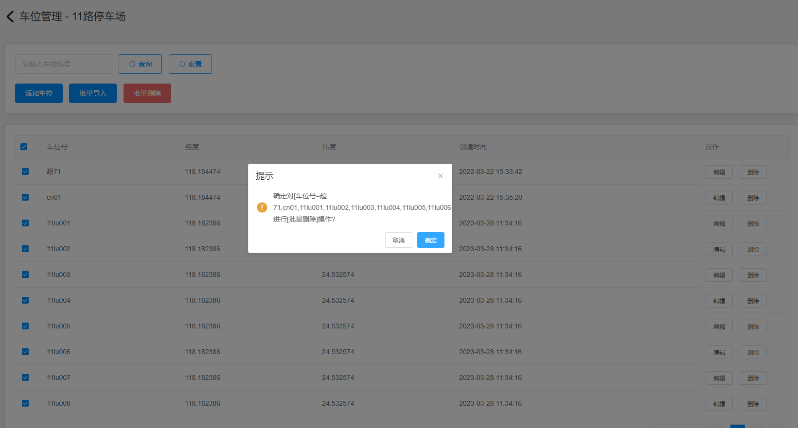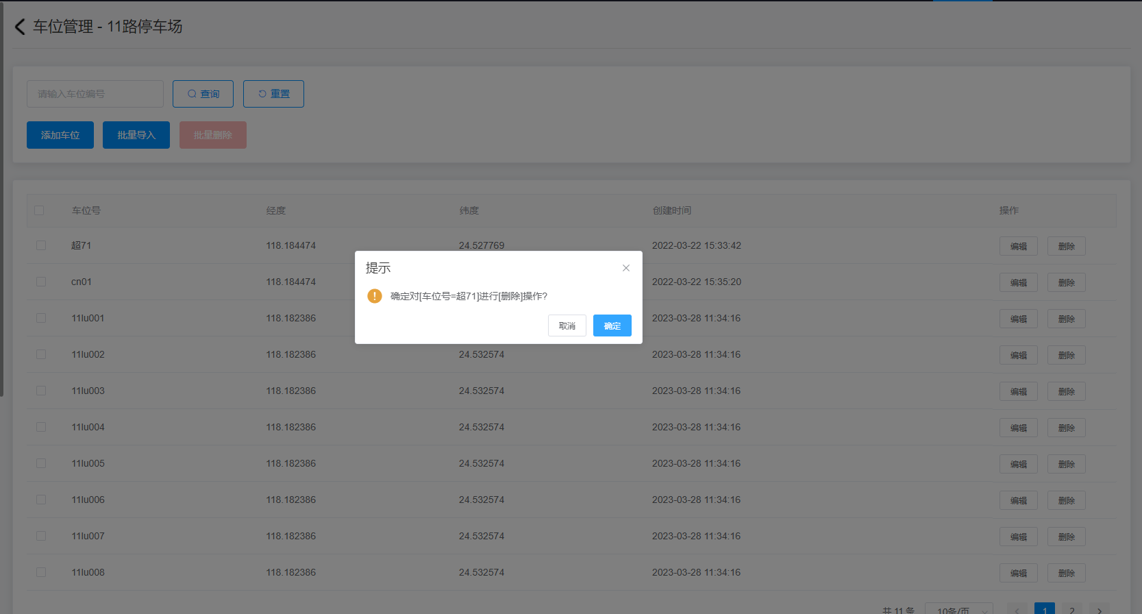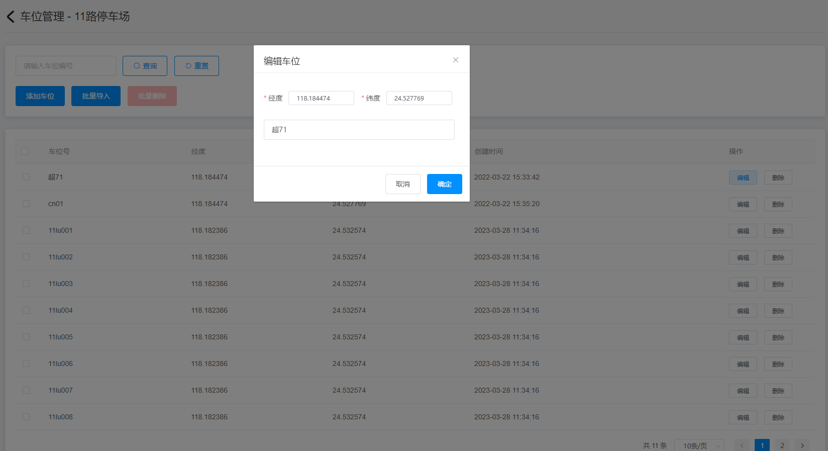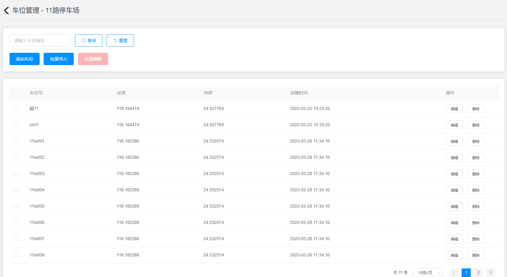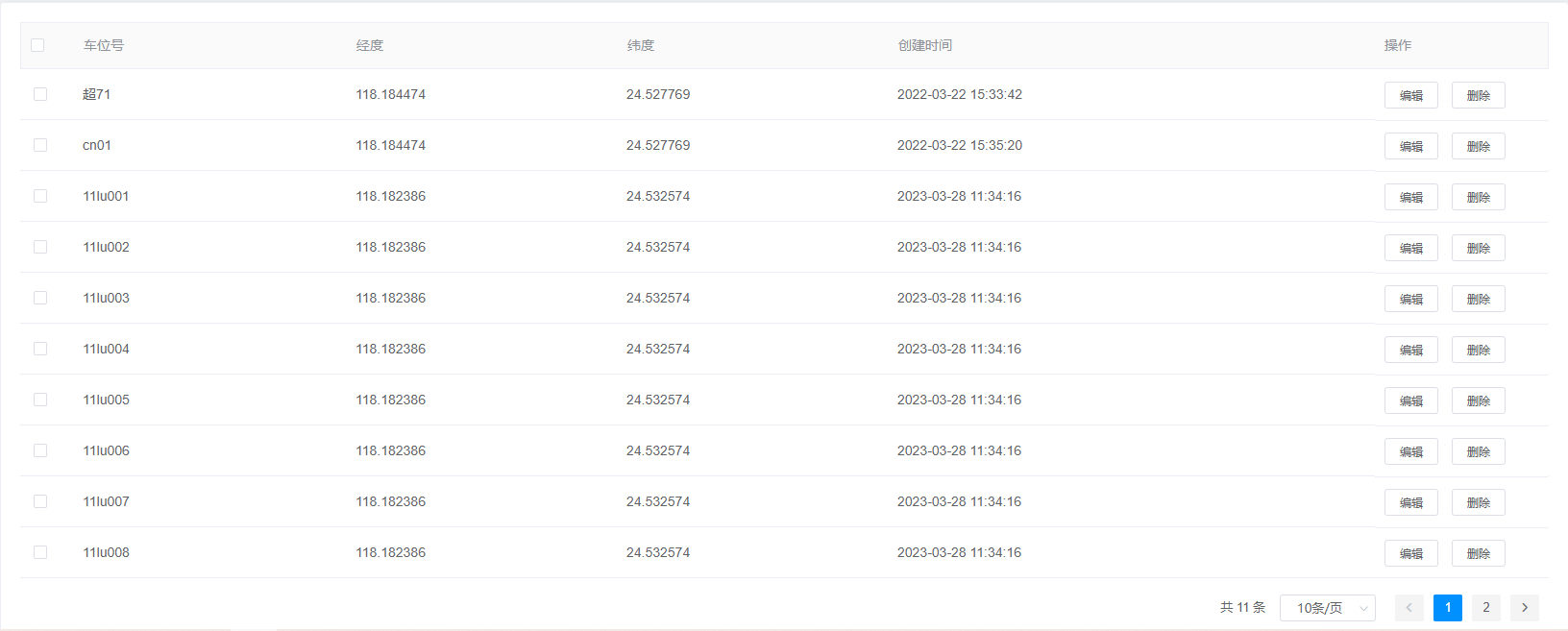 5.查询结果:该查询结果由车位号、经度、维度、创建时间、操作(编辑:可编辑该车位经纬度以及车位号、删除:删除车位)组成。