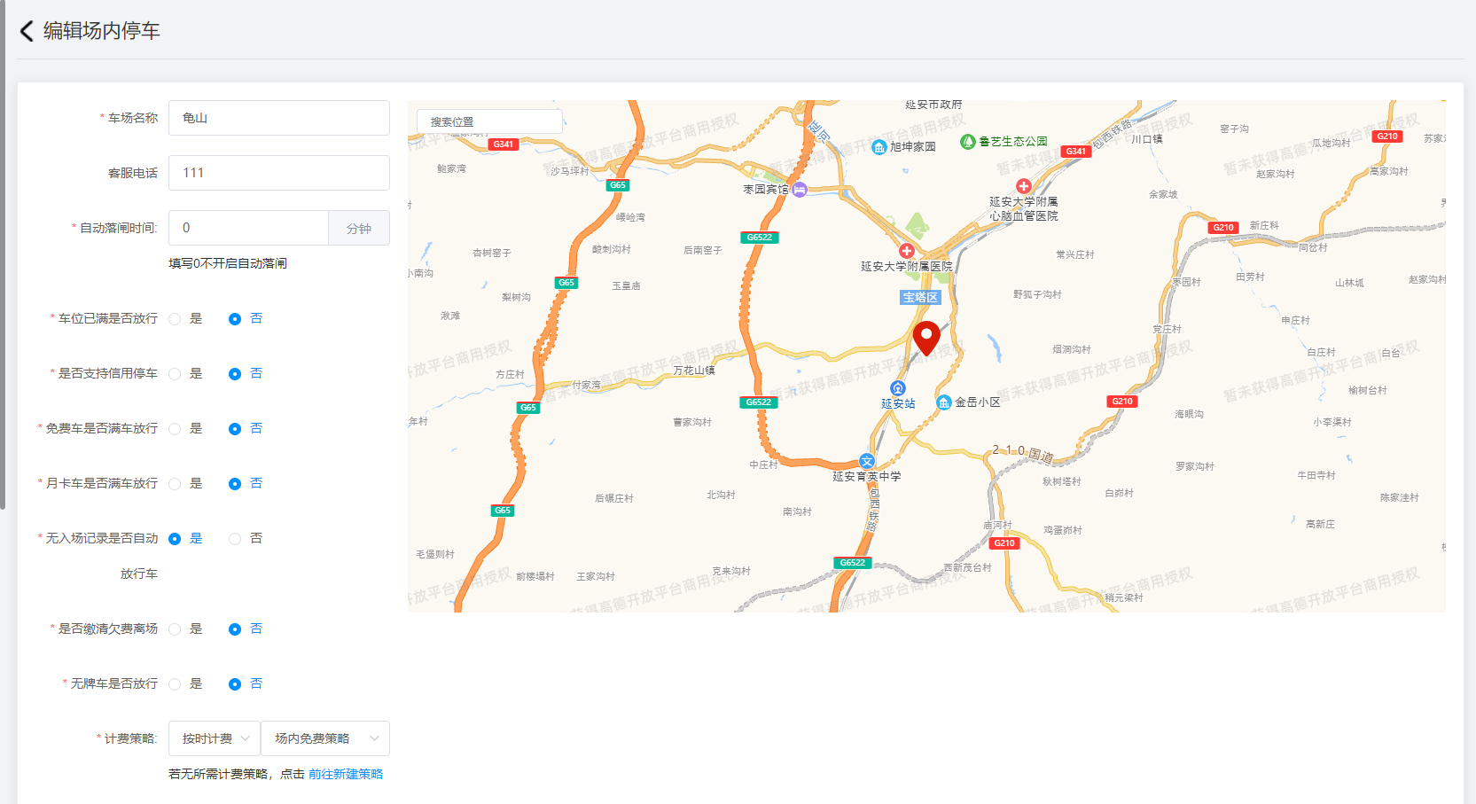编辑:点击查询结果右侧的“编辑”按钮可以编辑车场收费规则及设置车场名称等相关信息。