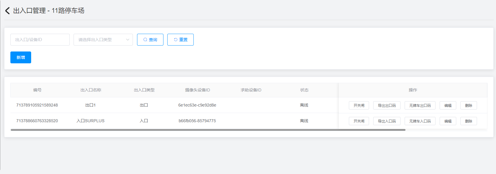 3.查询结果:由编号、出入口名称、出入口类型、摄像头设备ID、求助设备ID、状态、操作(开关闸、导出出口码、无牌车出口码、编辑、删除)组成。