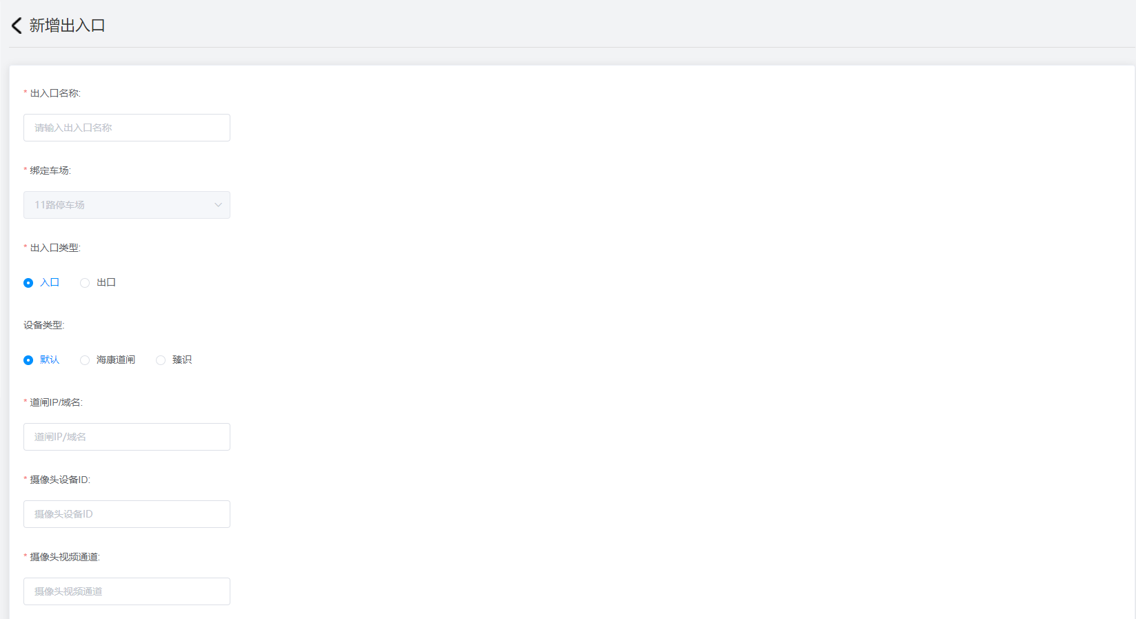 1.新增:点击查询内容左下方的“新增”按钮即可填写出入口名称、绑定车场、选择出入口等信息新增出入口。