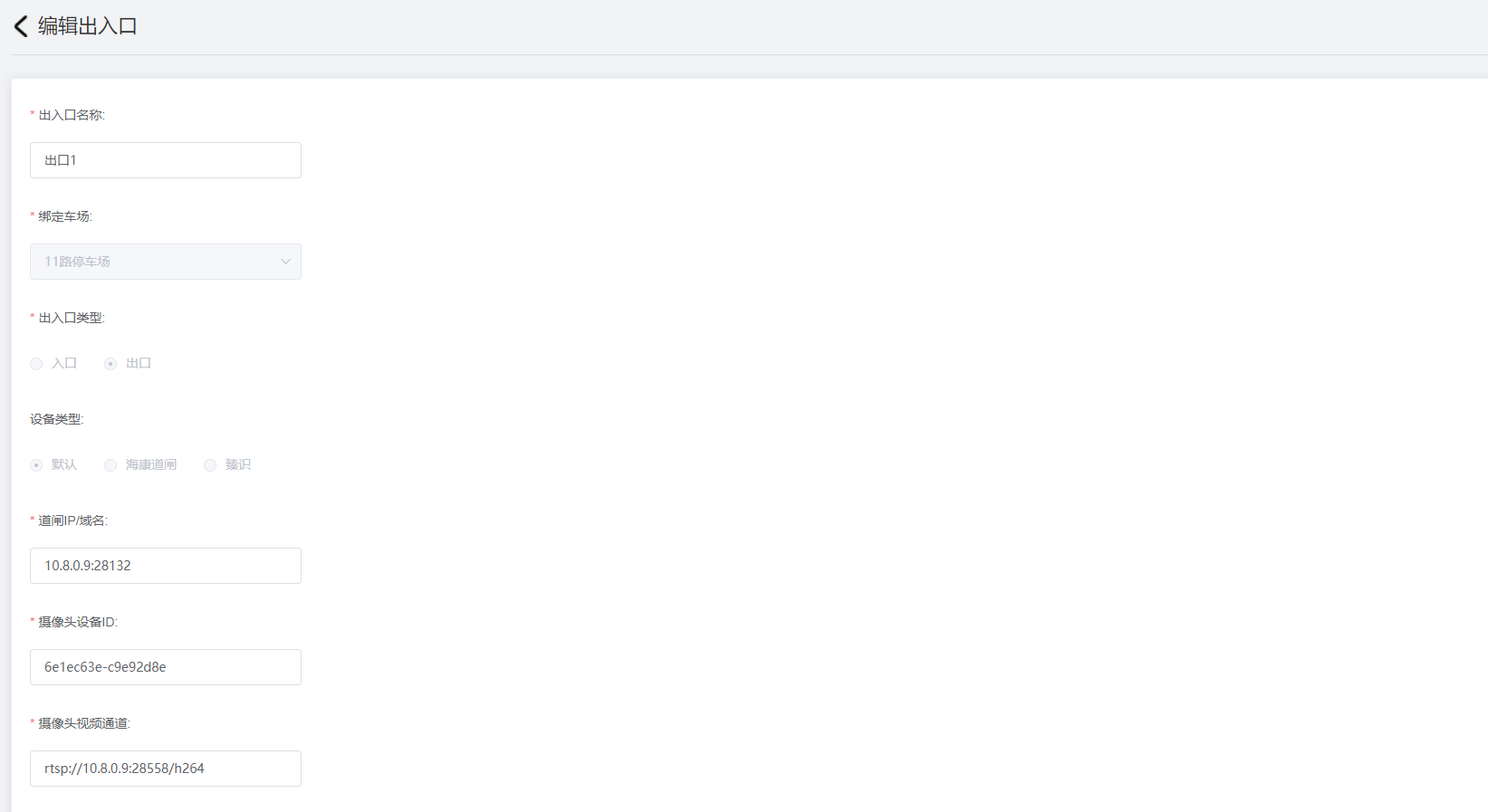 出入口:点击查询结果右侧的“出入口”按钮即可进入该车场出入口管理页面查看、编辑该车场出入口信息以及对该车场出入口远程开关闸;