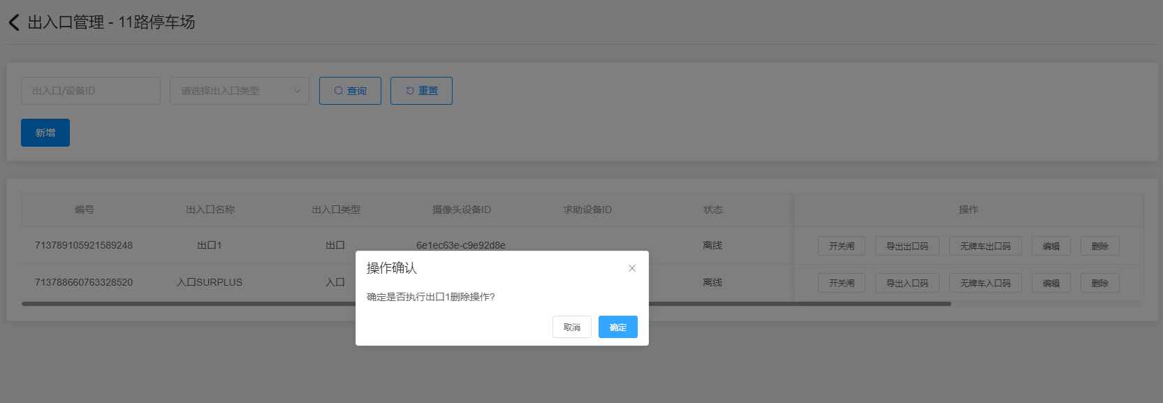 4.操作:开关闸、导出出口码、无牌车出口码、编辑、删除。