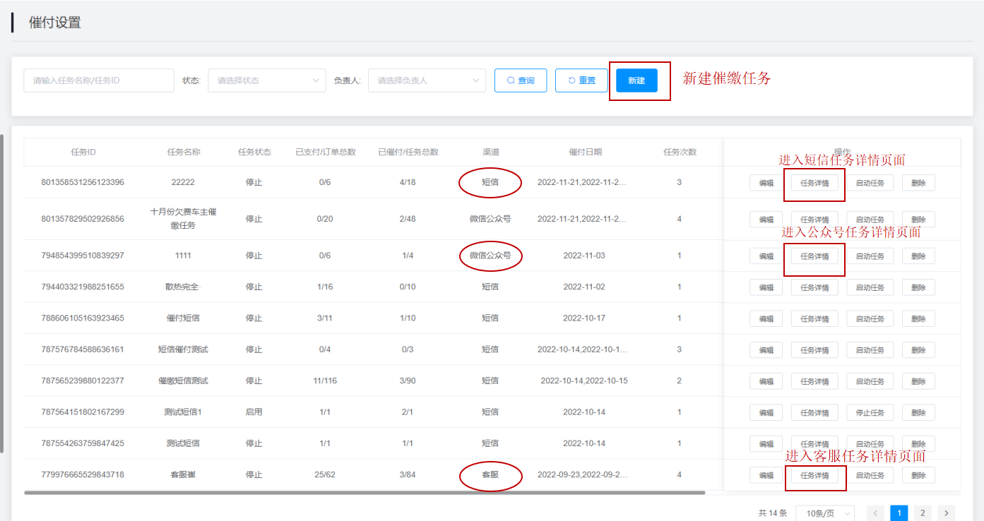 任务详情:点击查询结果右侧的“任务详情”按钮即可进入该催付任务的详情页。(不同渠道进入不同的任务详情页面)