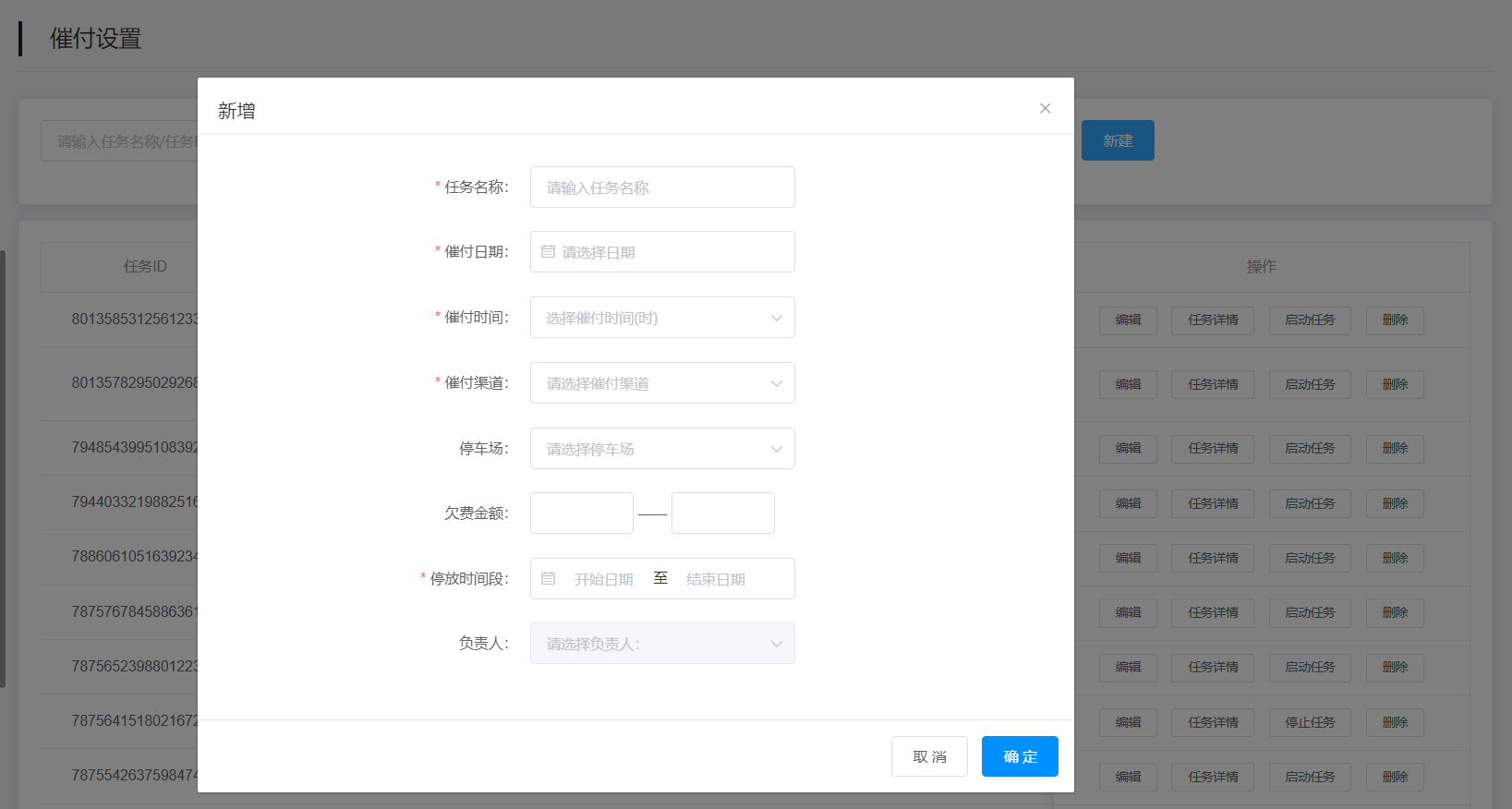 1.新建:点击查询内容右侧的“新建”按钮即可填写任务名称、催付日期、催付渠道、欠费金额、停放时间段等信息进行新增催缴任务。