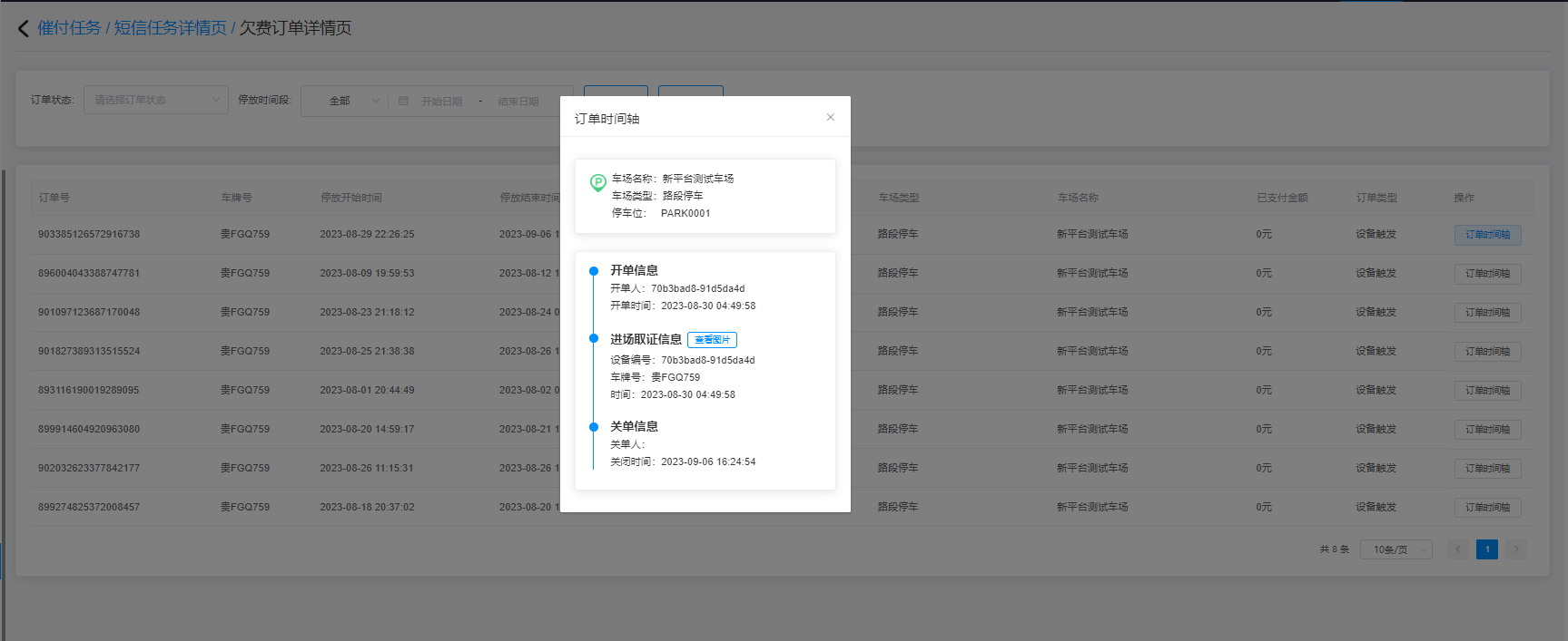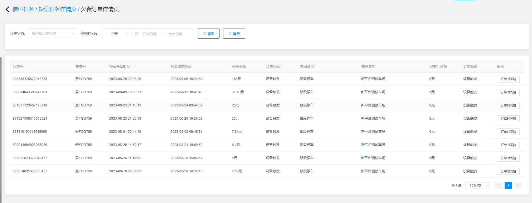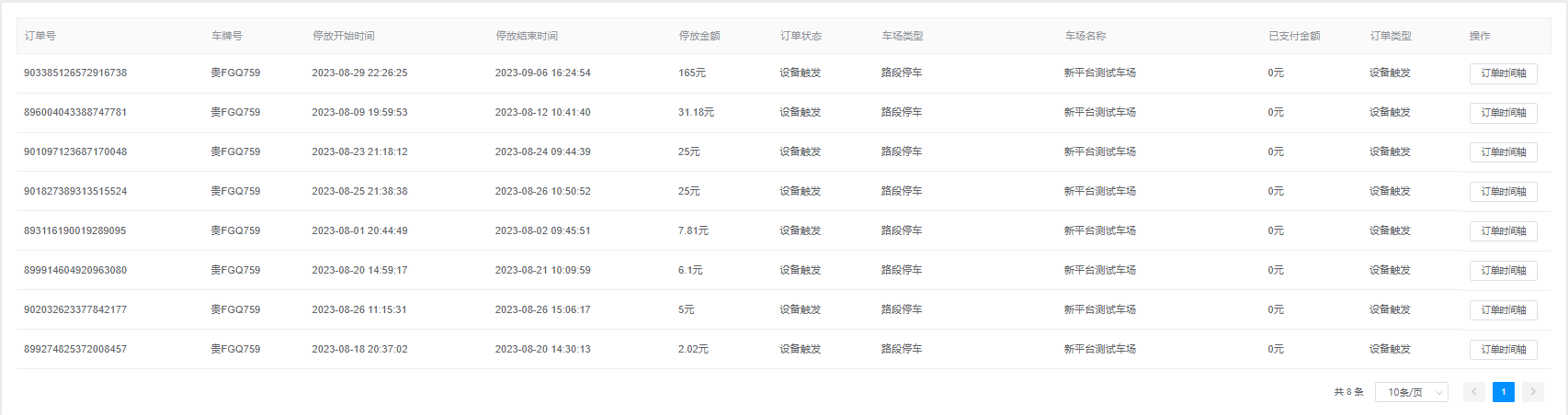 2.查询结果由订单号、车牌号、停放开始时间、停放结束时间、停放金额、订单状态、车场类型、车场名称、已支付金额、订单类型、操作(订单时间轴)组成;
