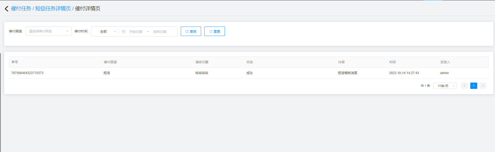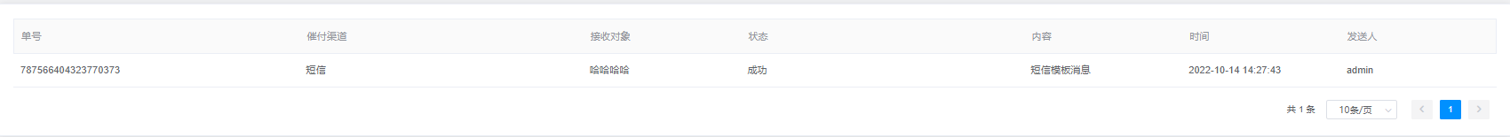 .查询结果由单号、催付渠道、接收对象、状态、内容、时间、发送人组成;