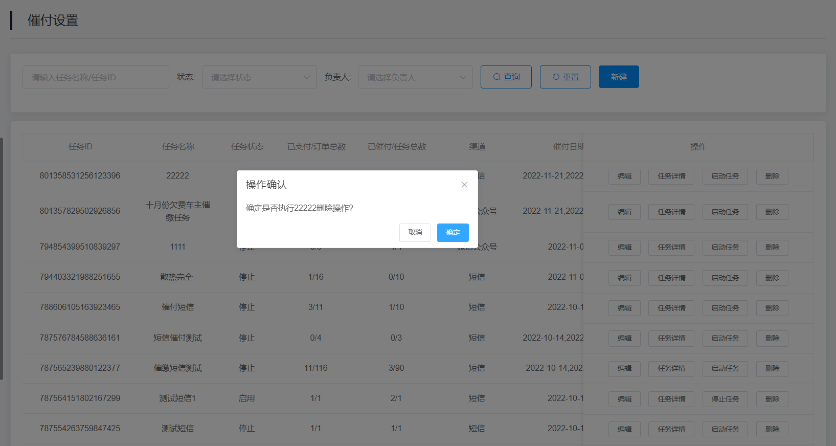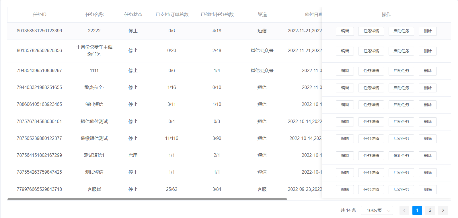 3.查询结果:该查询结果由任务ID、任务名称、任务状态、已支付/订单总数、已催付/任务总数、渠道、催付日期、任务次数、催付时间、负责人、创建人、创建时间、操作(编辑、任务详情、启动/停止任务、删除)组成。通过查询条件进行筛查催缴任务信息查找。