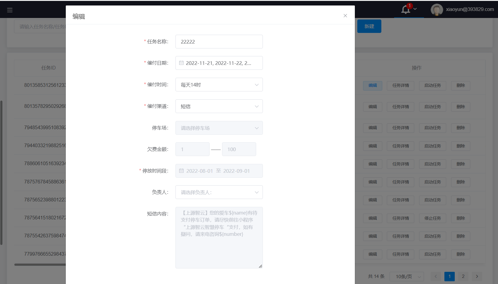 启动/停止任务:点击查询结果右侧的“启动/停止任务”按钮选择是否启动任务,处于启动的催付任务会根据任务设置对欠费车主进行催缴提示。