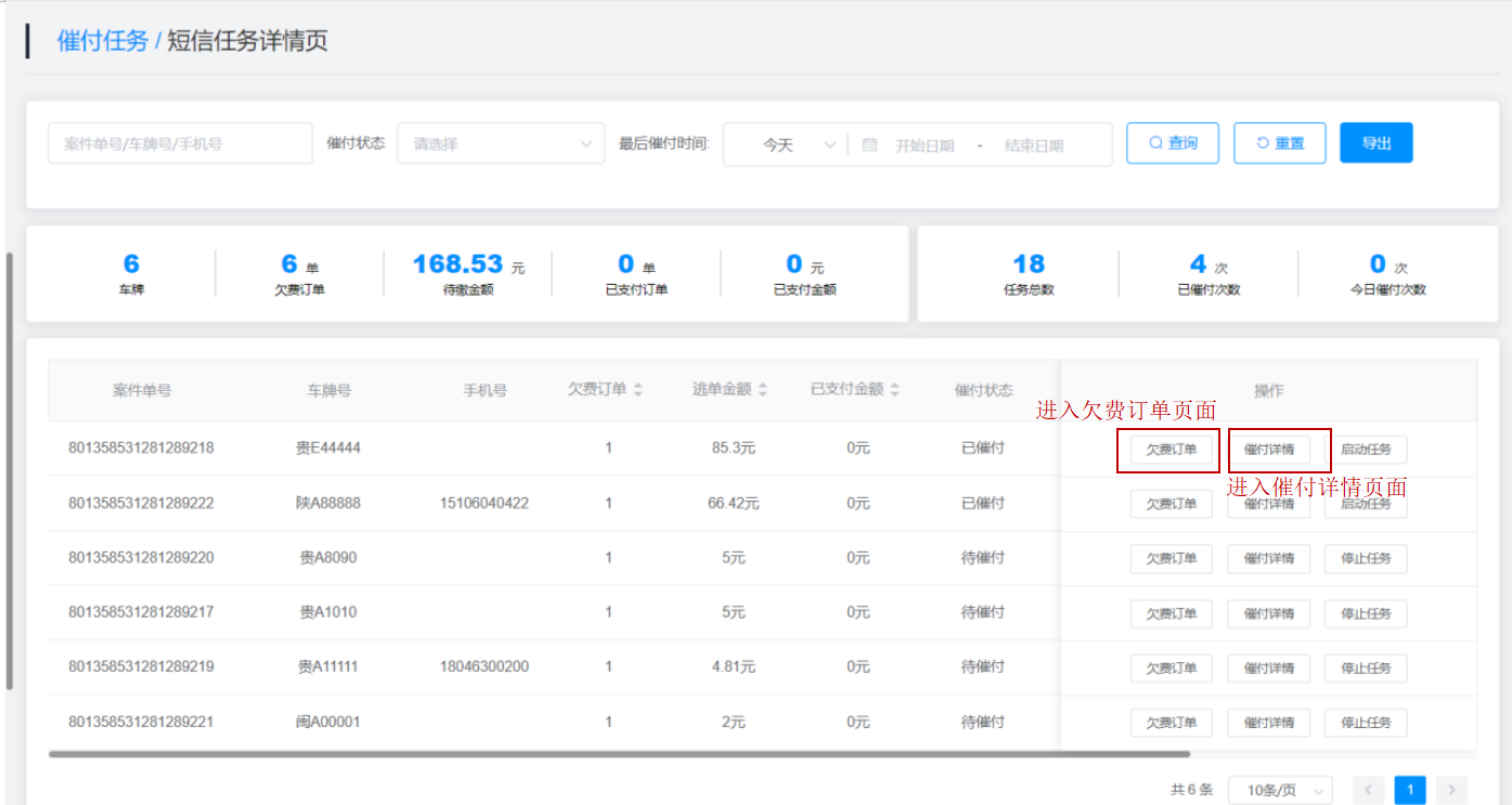 催付详情:点击查询结果右侧的“催付详情”按钮即可进入该车牌号催付详情页面。