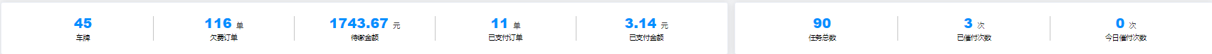 2.数据统计概况:该数据统计分别为车牌、欠费订单、待缴金额、已支付订单、已支付金额、任务总数、已催付次数、今日催付次数。