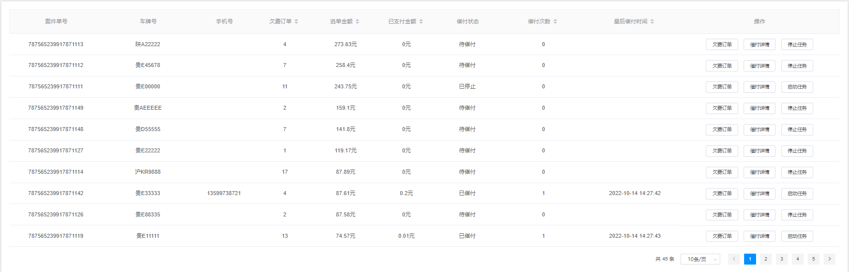 3.查询结果由案件单号、车牌号、手机号、逃单金额、已支付金额、催付状态、催付次数、最后催付时间、操作(欠费订单、催付详情、启动/停止任务)组成;